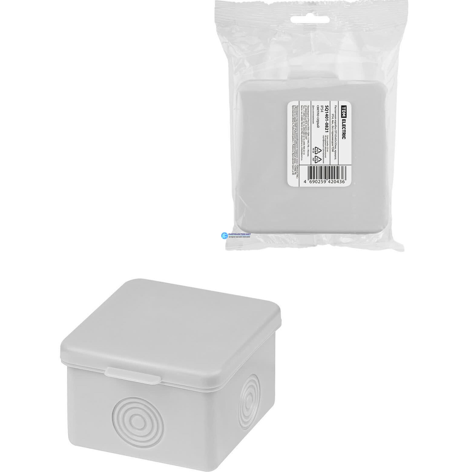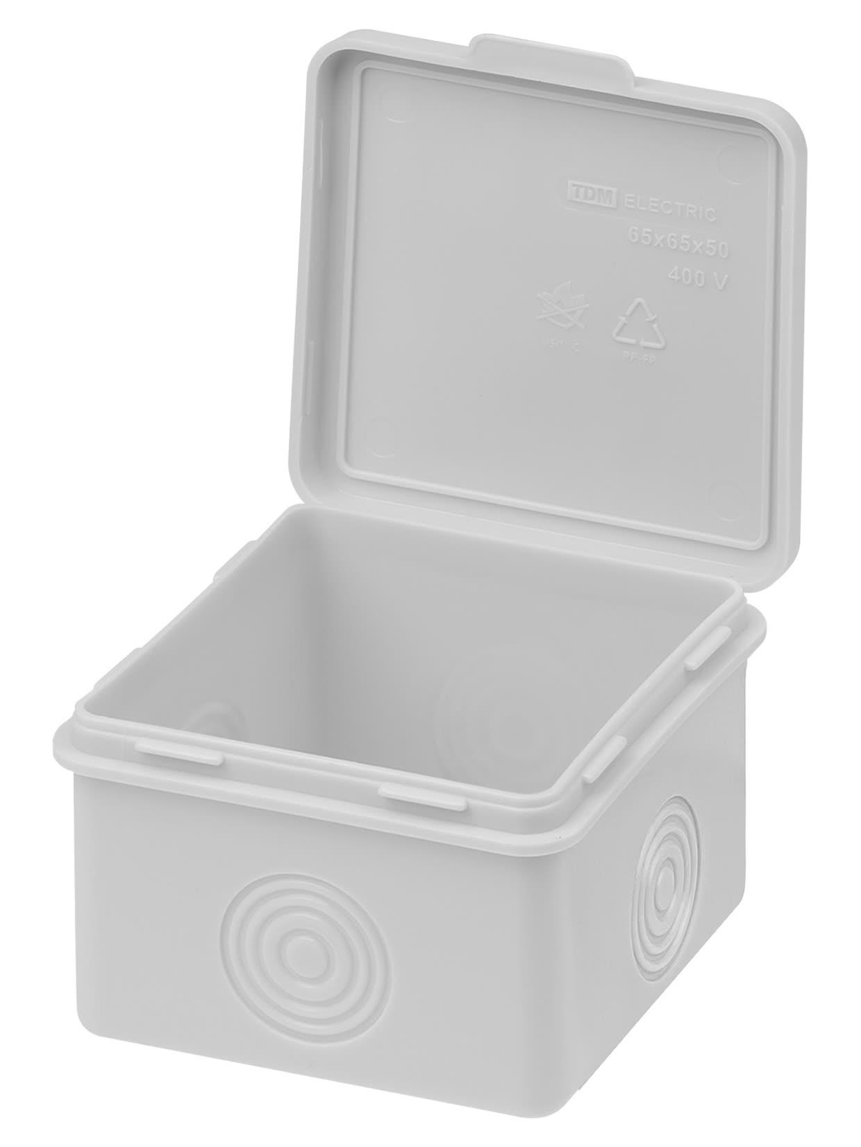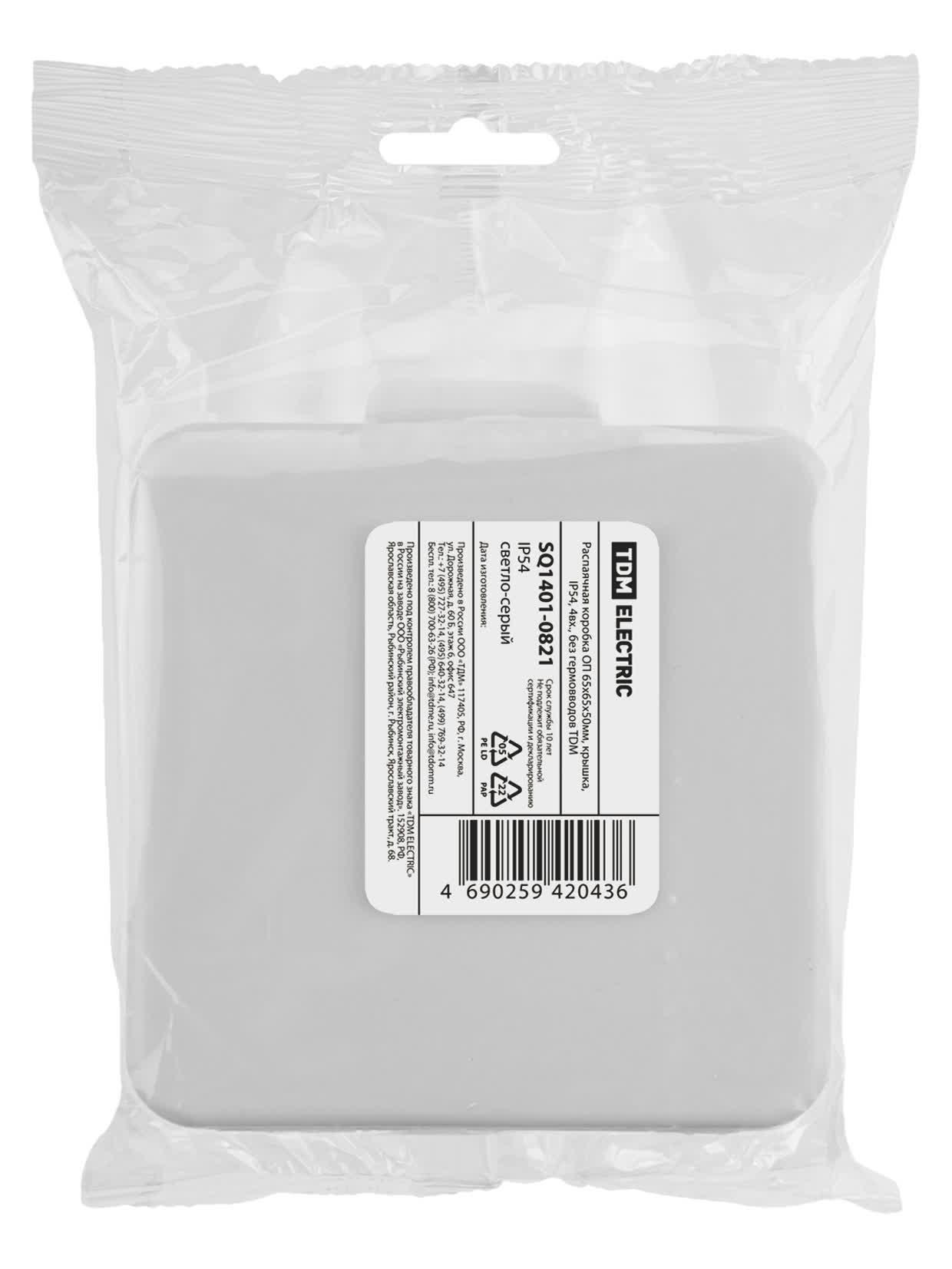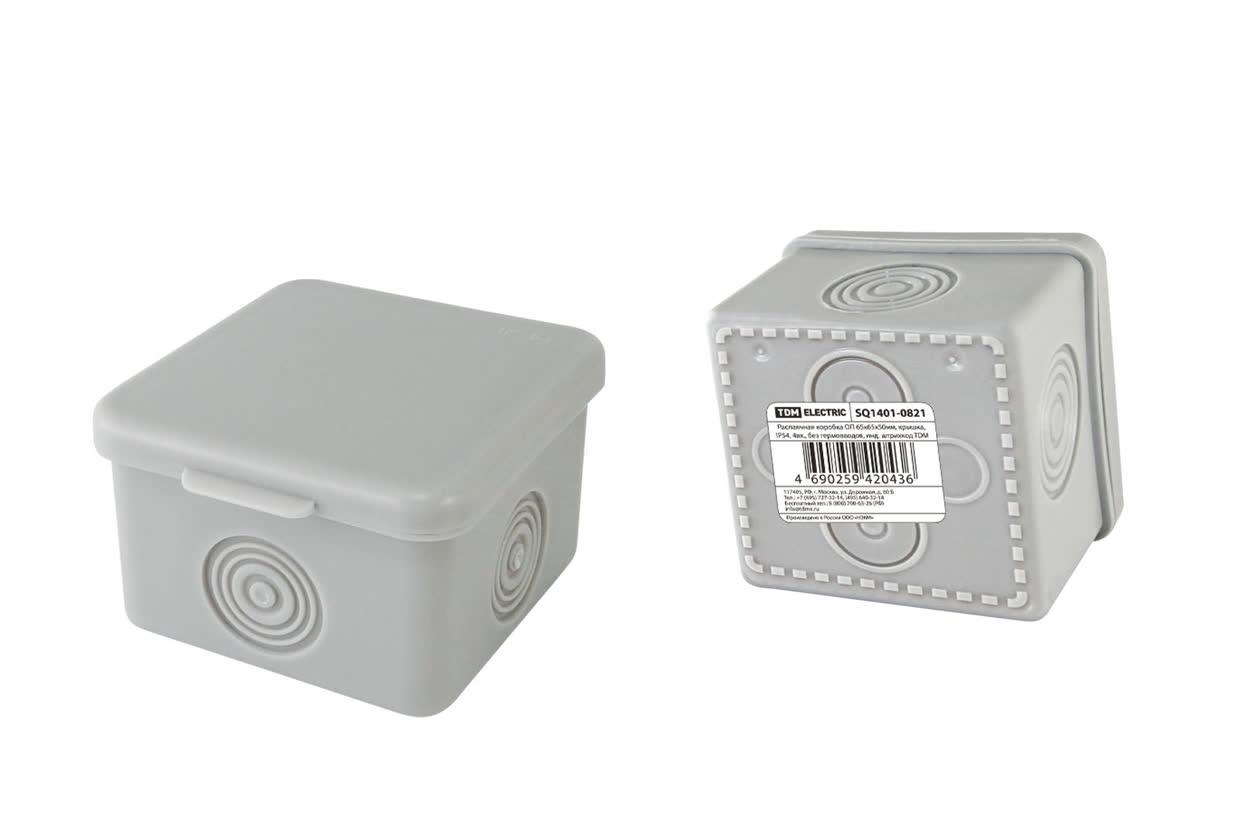 Распаячная коробка ОП 65х65х50мм крышка IP54 4вх. без гермовводов инд. штрихкод, код SQ1401-0821, производитель TDM