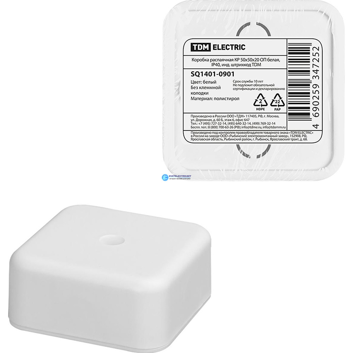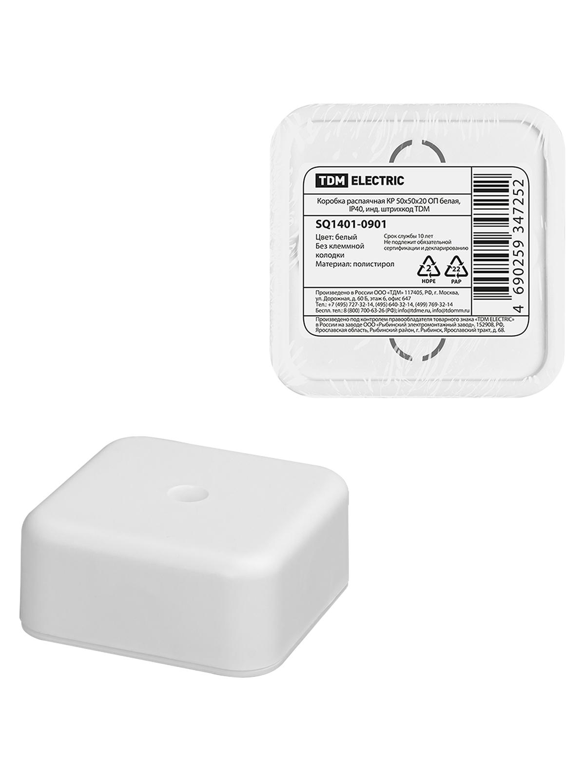 Коробка распаячная КР 50х50х20 ОП белая, IP40, инд. штрихкод, код SQ1401-0901, производитель TDM