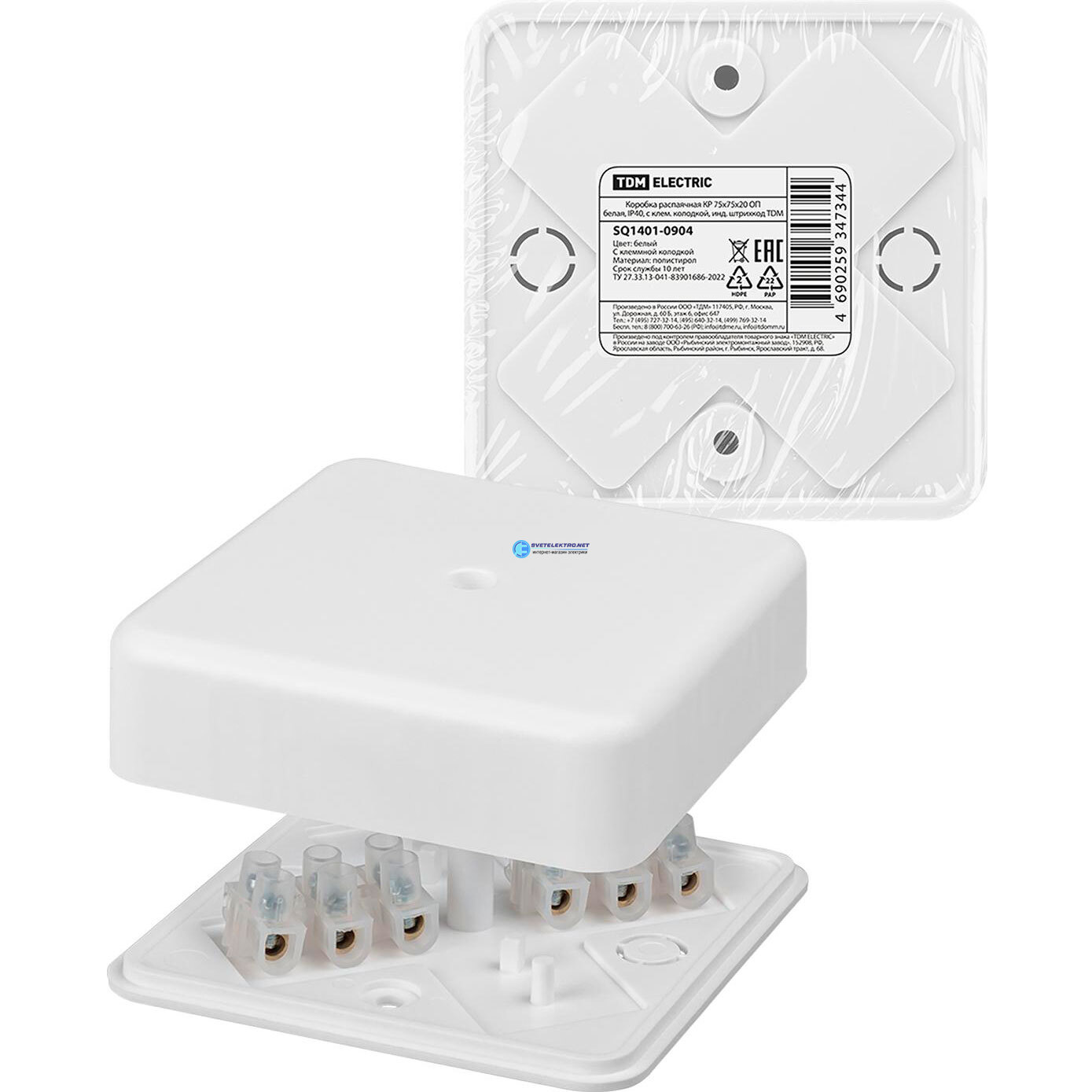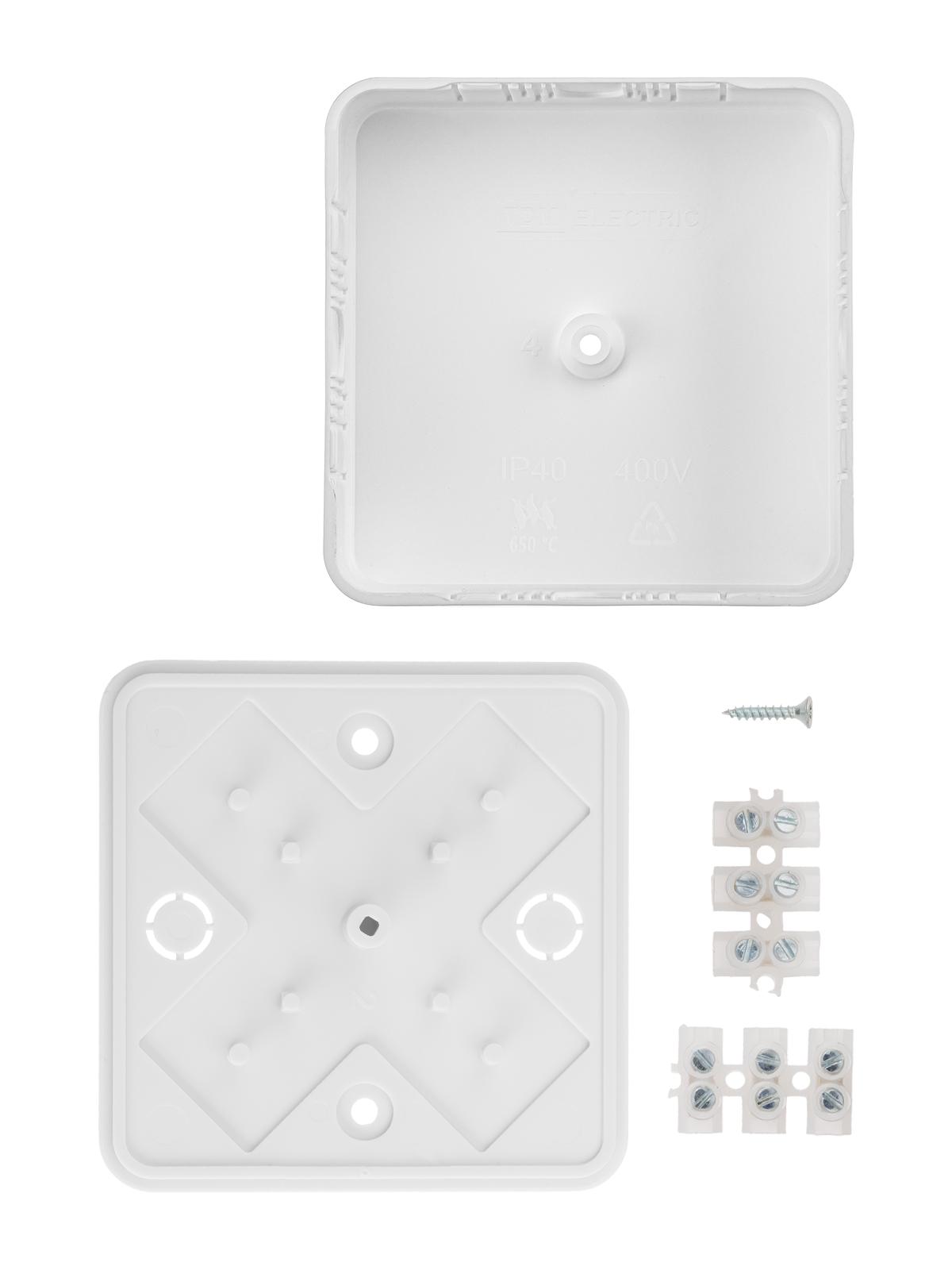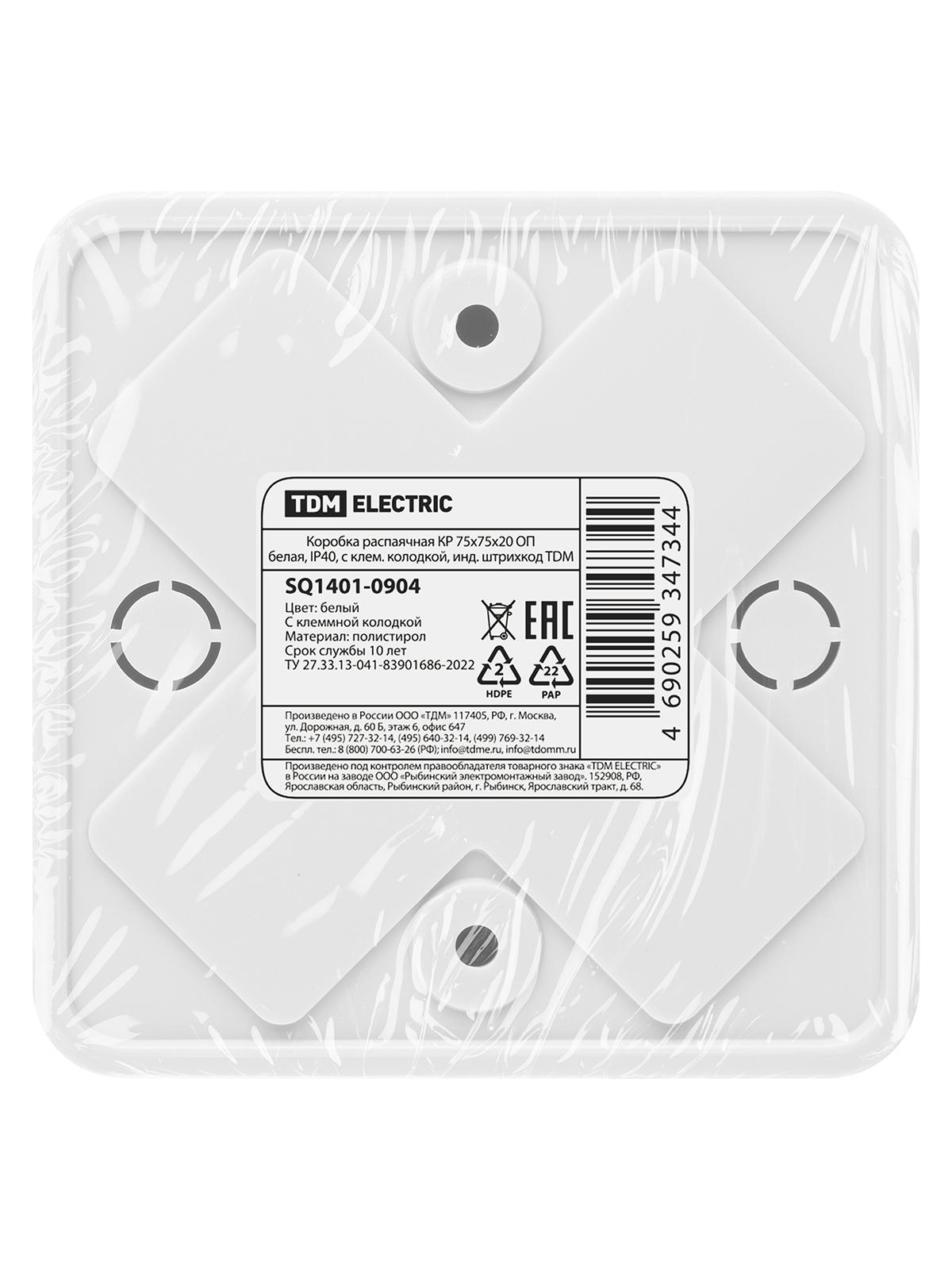 Коробка распаячная КР 75х75х20 ОП белая IP40 с клем. колодкой инд. штрихкод, код SQ1401-0904, производитель TDM