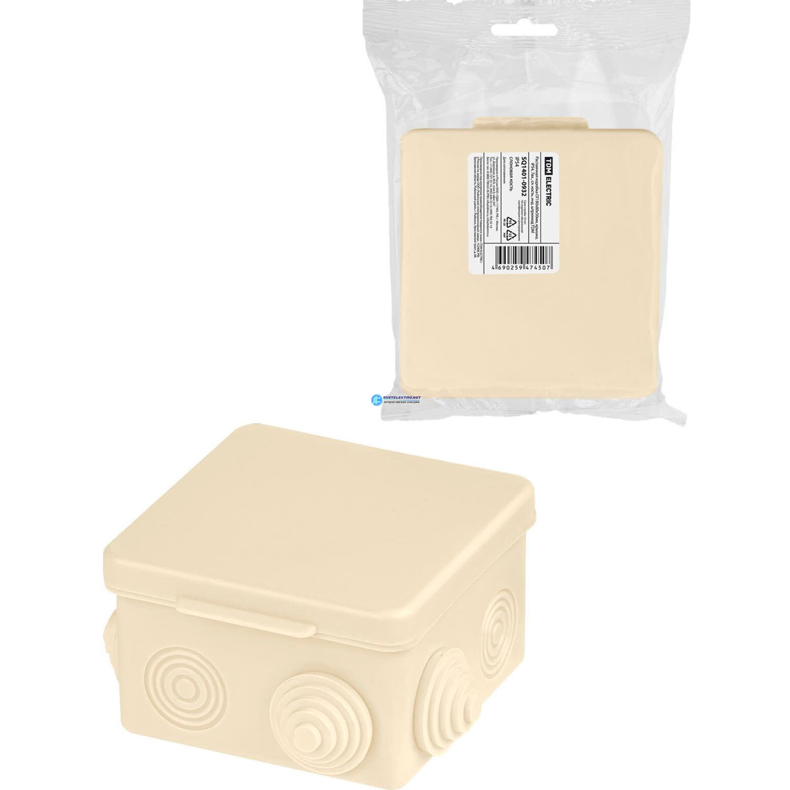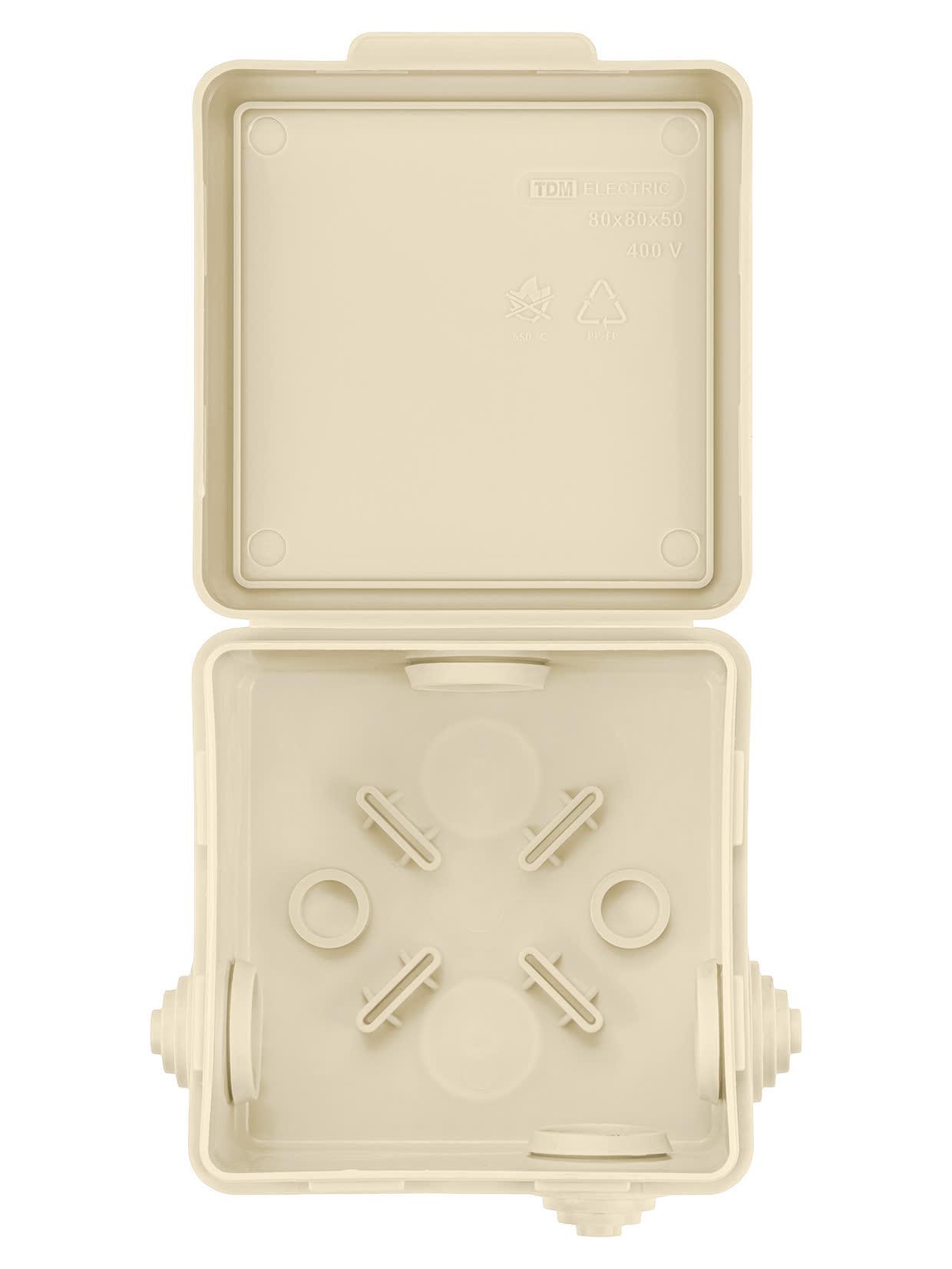 Распаячная коробка ОП 80х80х50мм крышка IP54 7вх. сл. кость инд. штрихкод, код SQ1401-0932, производитель TDM