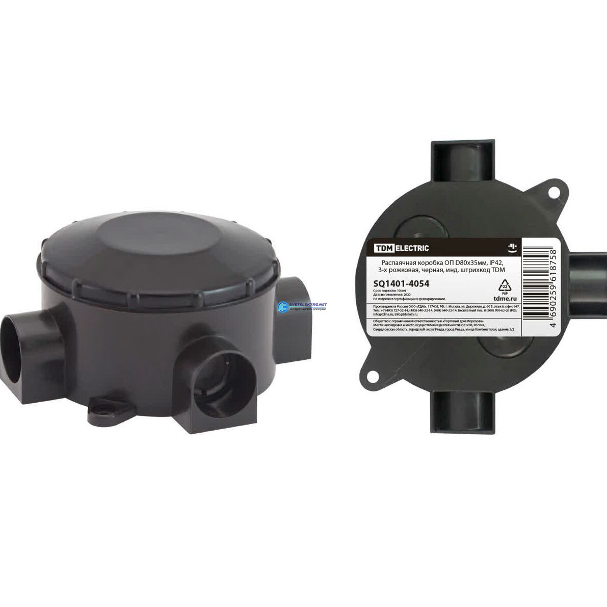 Распаячная коробка ОП D80х35мм IP42 3-х рожковая черная инд. штрихкод, код SQ1401-4054, производитель TDM