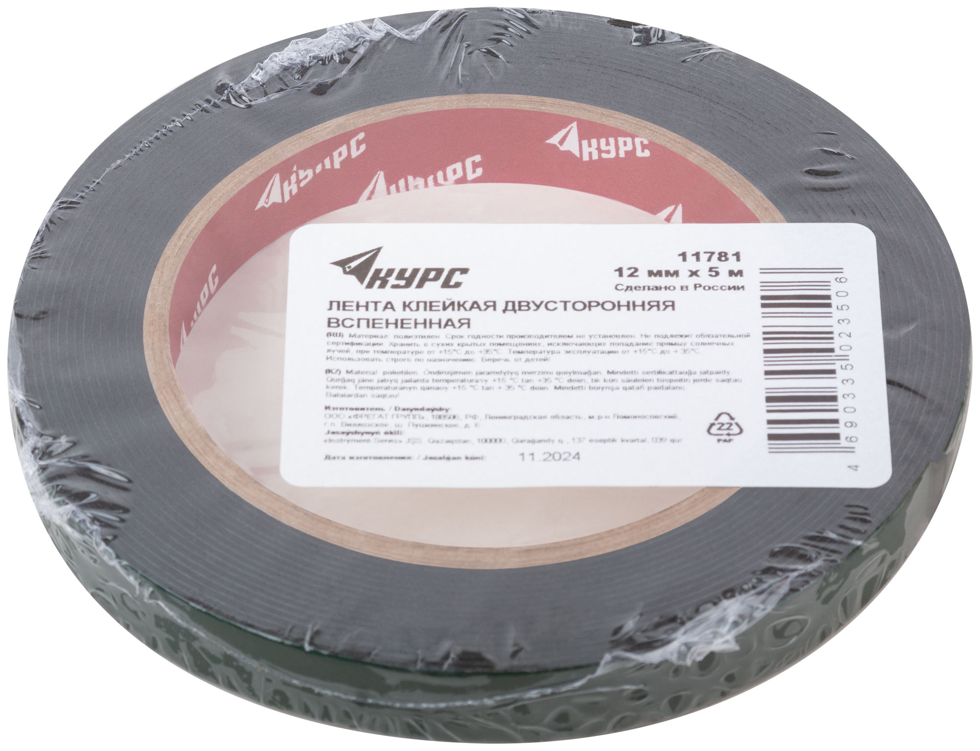 Лента монтажная клейкая на вспененной основе, белая, 12 мм х 5 м, код 11781, производитель КУРС РОС