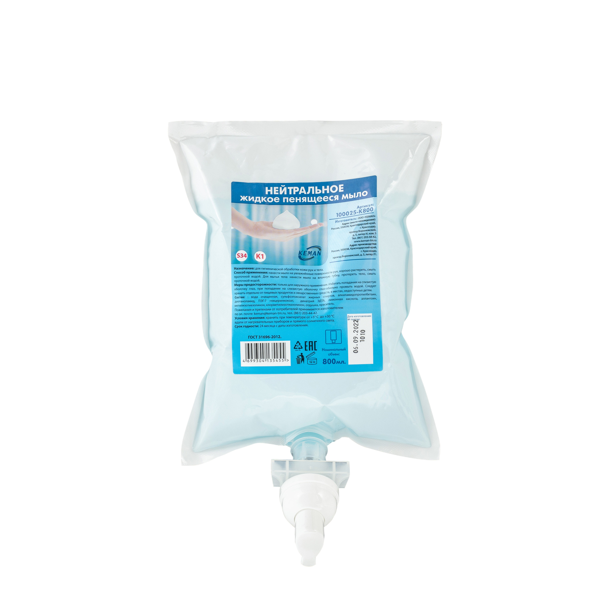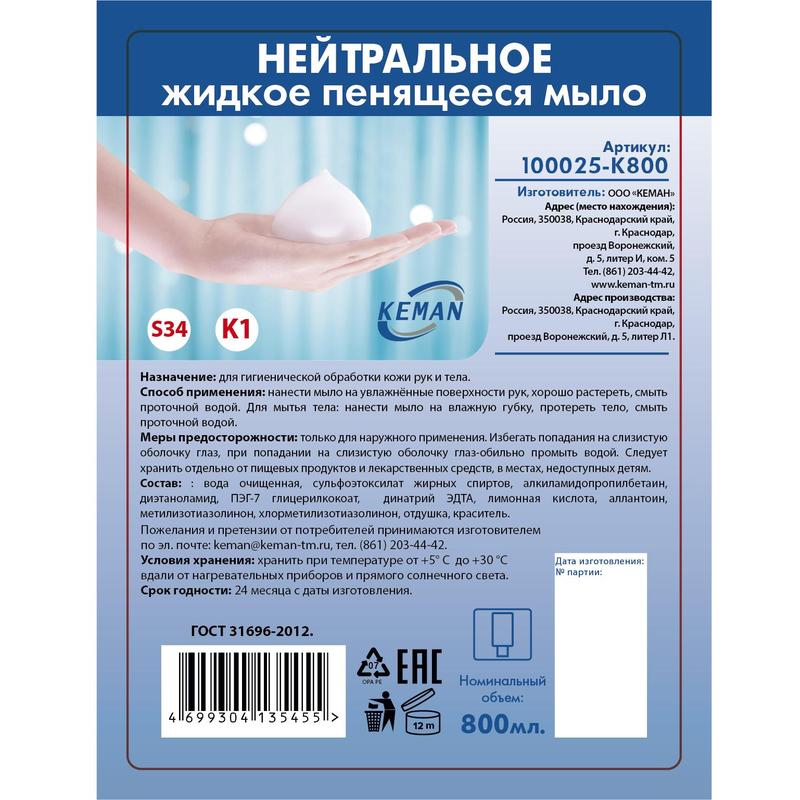 Жидкое пена-мыло КАРТРИДЖНОЕ 0,8л нейтральное, код 23926, производитель KEMAN
