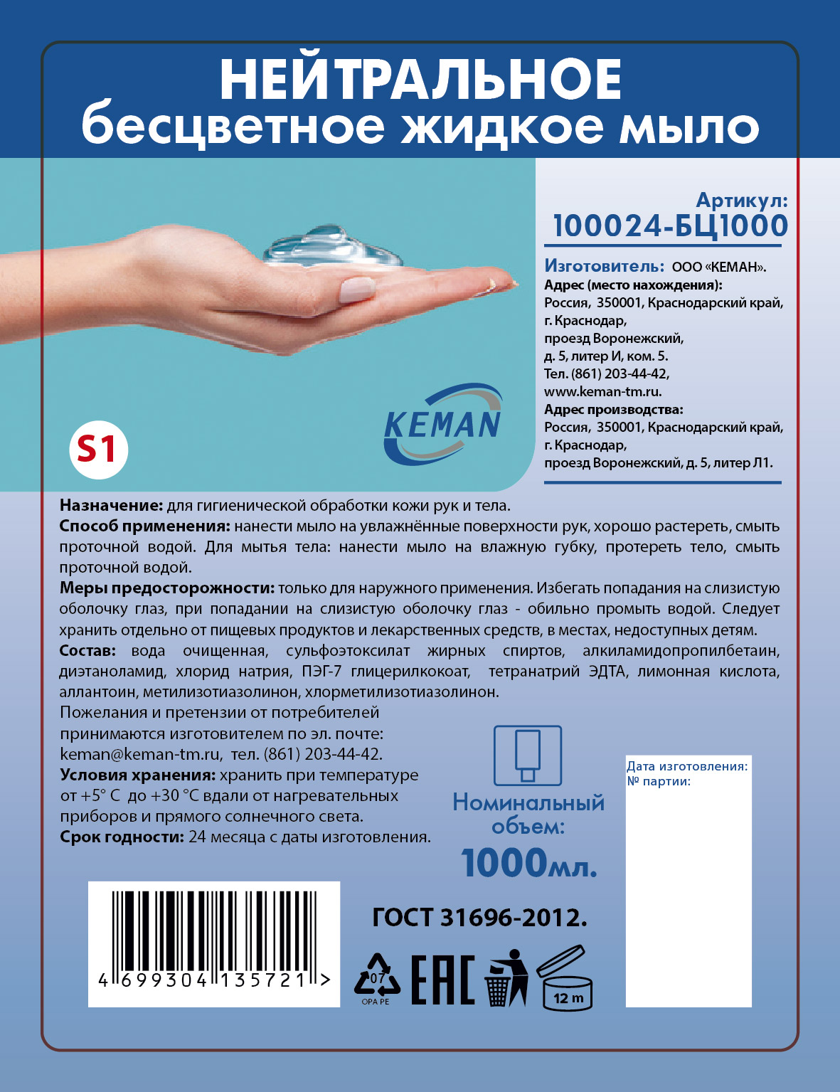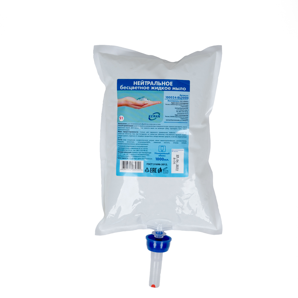 Жидкое мыло ''Нейтральное бесцветное'' картридж 1000 мл S1, КЕМАN, код 25066, производитель KEMAN