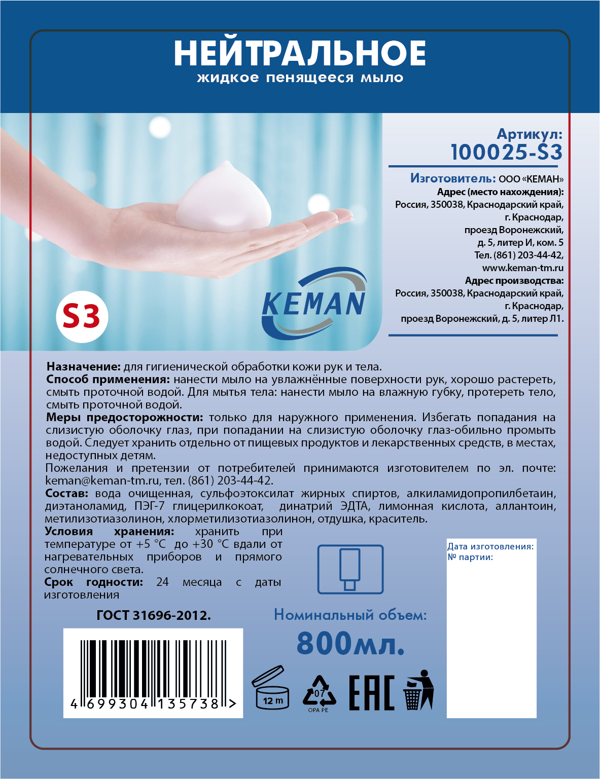Мыло-пена ''Нейтральное'' в картриджах S3, 800 мл,КЕМАN, код 25094, производитель KEMAN