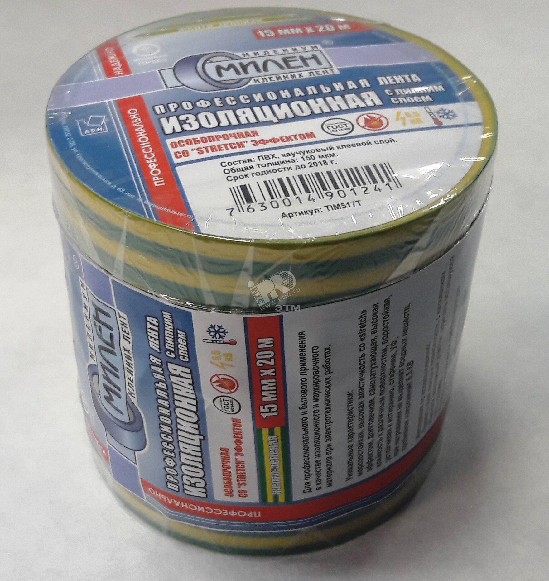 Изолента ПВХ желто-зеленая 15 мм 20м, код 9602, производитель МИЛЕН