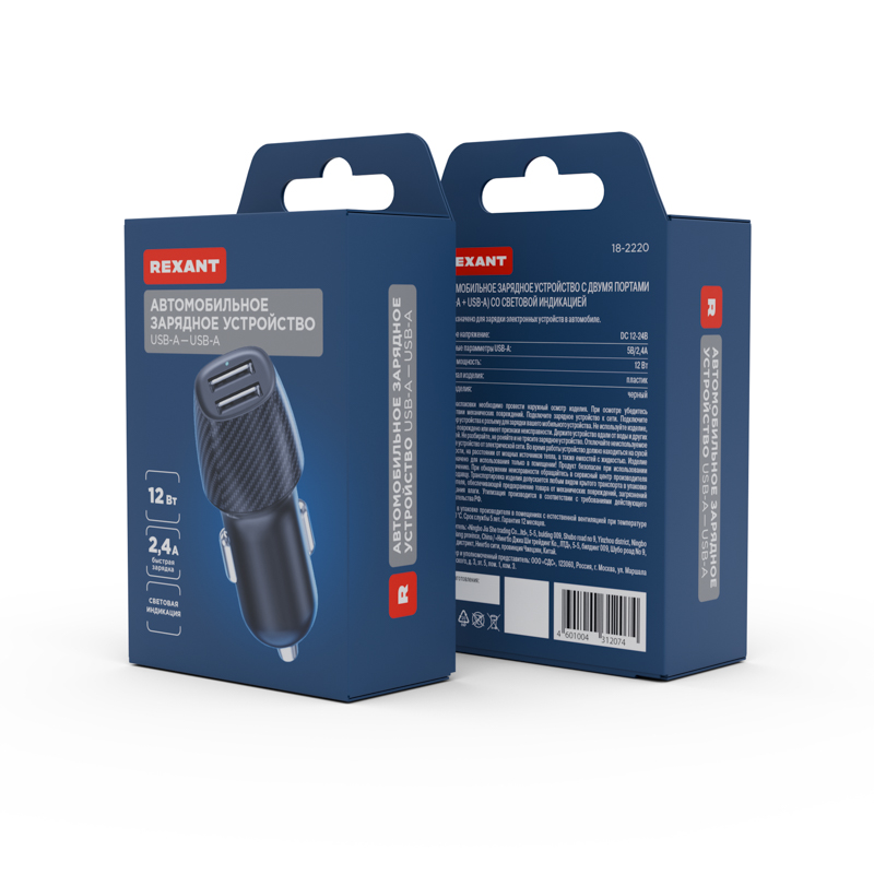 Устройство автомобильное зарядное c двумя портами (USB-А + USB-A) со световой индикацией, 12Вт, черное, код 18-2220, производитель REXANT