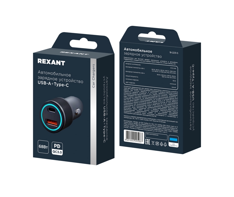 Зарядное устройство автомобильное c двумя портами USB-A + USB-A c LED-подсветкой 68Вт, код 18-2231-5, производитель REXANT