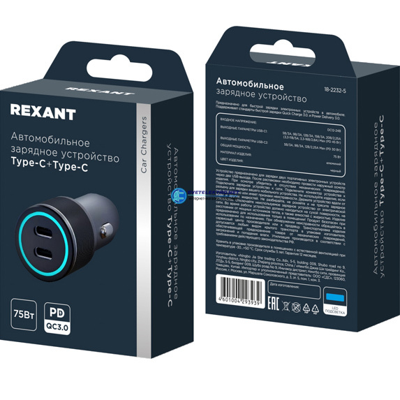 Зарядное устройство автомобильное c двумя портами USB-A + USB-A c LED-подсветкой 75Вт, код 18-2232-5, производитель REXANT
