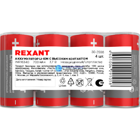 Батарейка Li-ion 16340, 3,7В, 700мАч, без платы защиты, 4 шт, код 30-2036, производитель REXANT