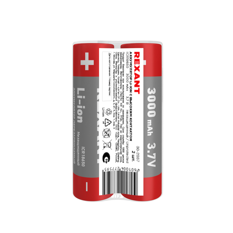 Батарейка AA Li-ion 18650, 3,7В, 3000мАч, без платы защиты, 2 шт 30-2037 REXANT