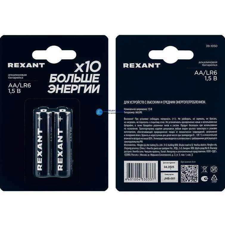 Батарейка алкалиновая AA/LR6 пальчиковая 1,5В блистер 2 шт., код 39-1050, производитель REXANT