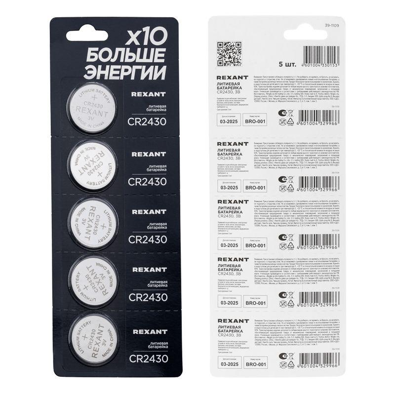 Батарейка литиевая CR2430 3В блистер 5 шт., код 39-1109, производитель REXANT