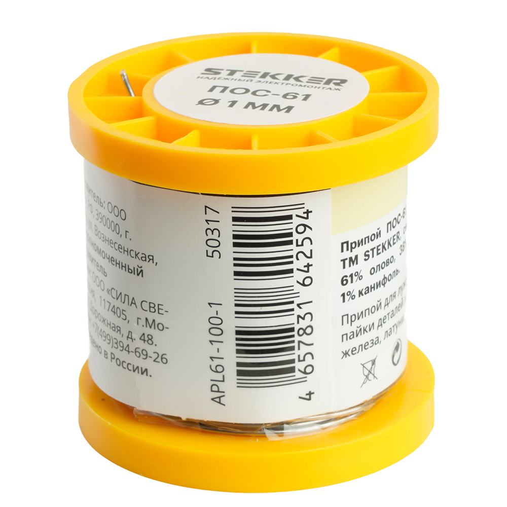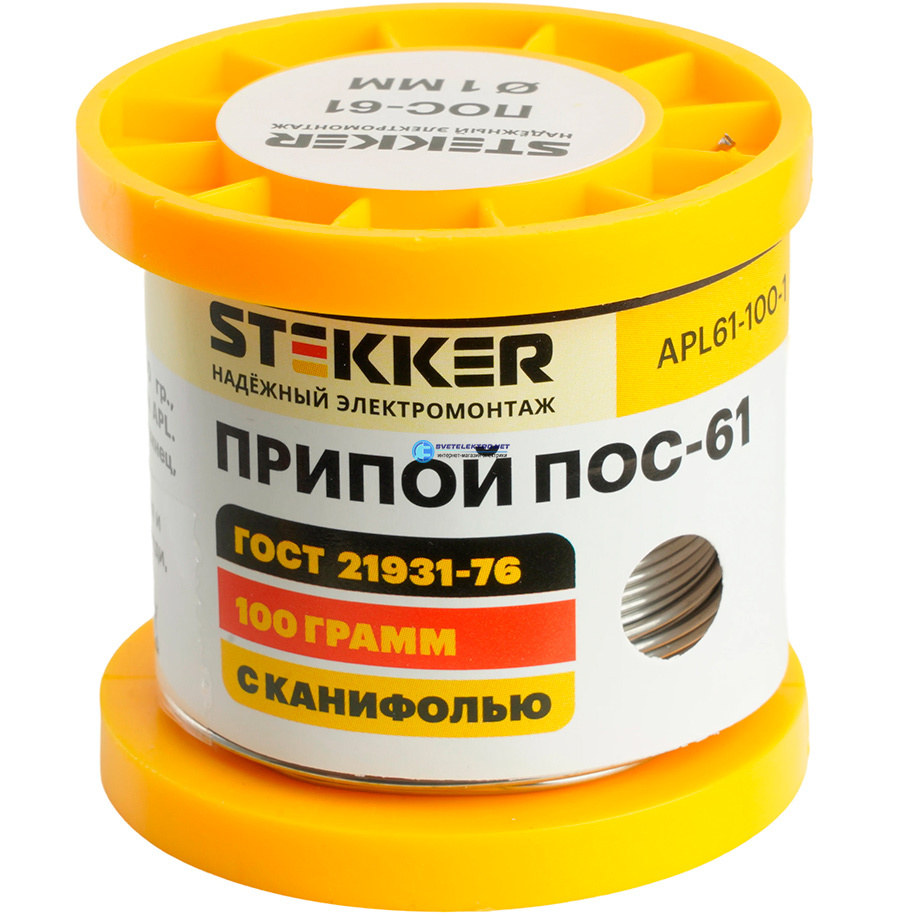 Припой ПОС-61 с канифолью в бобине 100гр (61% олово 38% свинец 1% канифоль), код APL61-100-1 50317, производитель Stekker