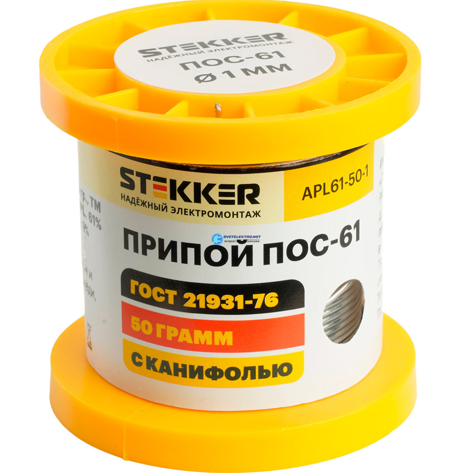 Припой ПОС-61 с канифолью в бобине 50гр (61% олово 38% свинец 1% канифоль), код APL61-50-1 50316, производитель Stekker