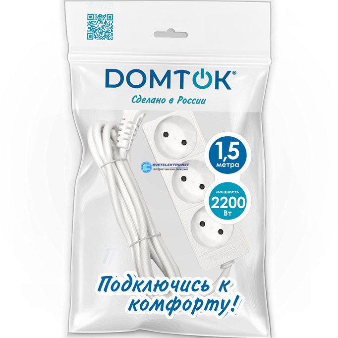 Удлинитель бытовой 3 гнезда, ПВС 2*1, 2,2кВт, без заземления, 1,5 метра 2349 DOMTOK