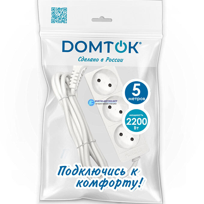 Удлинитель бытовой 3 гнезда, ПВС 2*1, 2,2кВт, без заземления, 5 метров 2352 DOMTOK