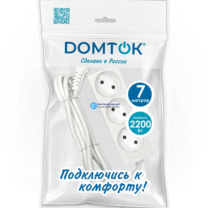 Удлинитель бытовой гнезда, ПВС 2*1, 2,2кВт, без заземления, 7 метров, код 2353, производитель DOMTOK