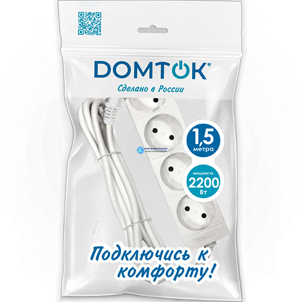 Удлинитель бытовой гнезда, ПВС 2*1, 2,2кВт, без заземления, 1,5 метра DOMTOK, код 2354, производитель Союз