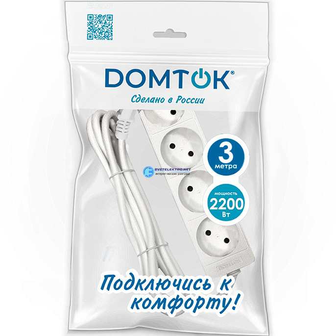 Удлинитель бытовой 4 гнезда, ПВС 2*1, 2,2кВт, без заземления, 3 метра 2356 DOMTOK