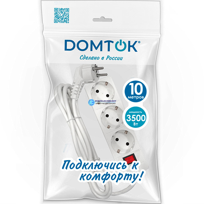Удлинитель бытовой 3 гнезда, ПВС 3*1, 3,5 кВт, с заземлением, с выключателем, 10 метров DOMTOK 2380 DOMTOK