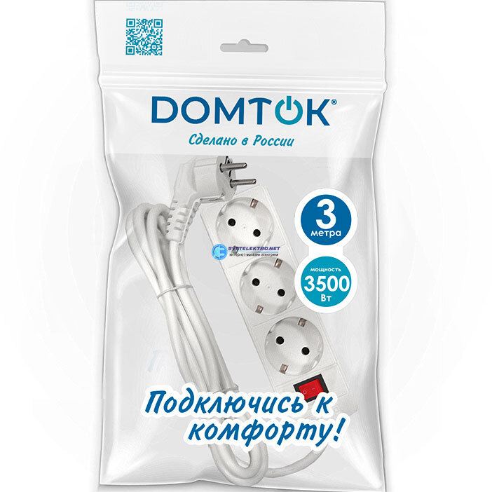 Удлинитель бытовой 3 гнезда, ПВС 3*1, 3,5кВт, с заземлением, с выключателем, 3 метра 2381 DOMTOK