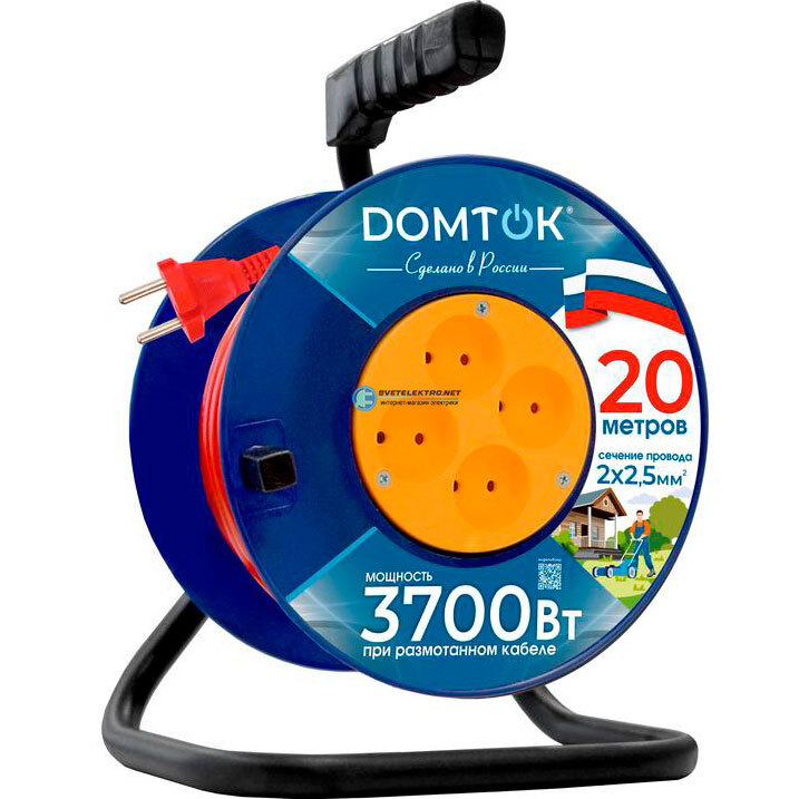 Удлинитель силовой на катушке 4 гнезда, ПВС 2*2,5, 3,7кВт, без заземления, 20 метров, код 2507, производитель DOMTOK