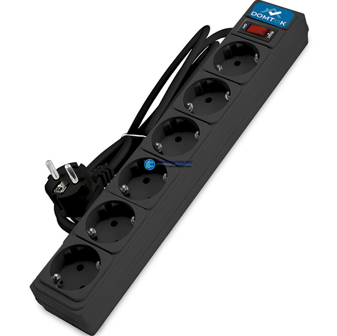 Фильтр-удлинитель 6 гнезд, ПВС 3*1, 10А/2,2кВт, выключатель с индикацией, с заземлением, черный, 1,8 метра, код 2521, производитель DOMTOK