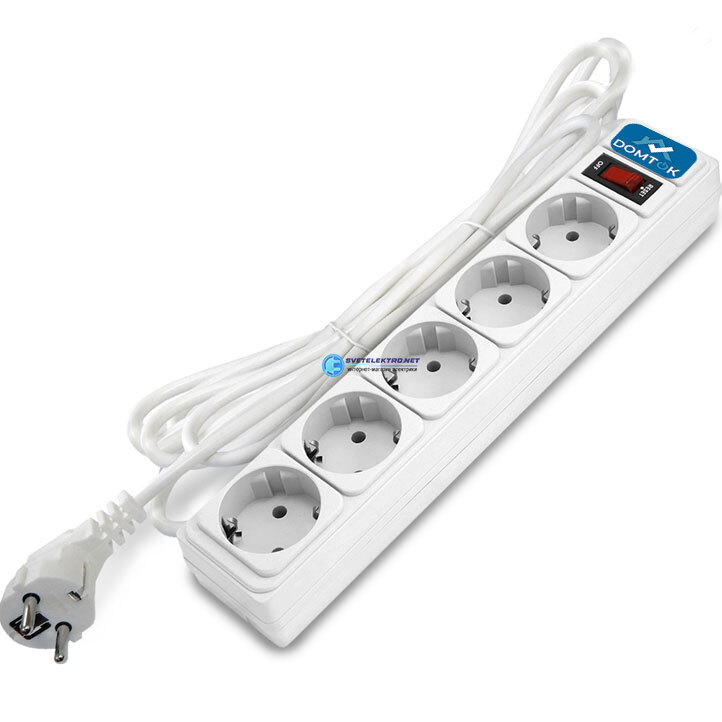 Фильтр-удлинитель гнезд, ПВС 3*1 10А/2,2кВт, выключатель с индикацией, с заземлением, белый, метров, код 2529, производитель DOMTOK