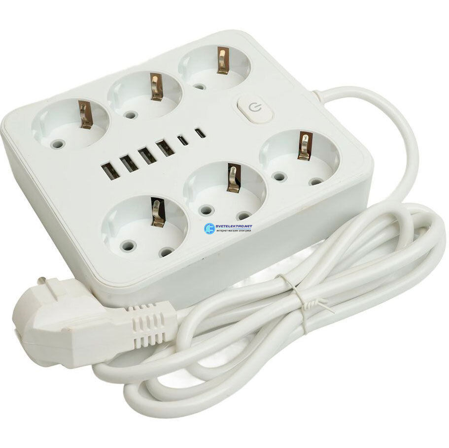Удлинитель 6-местный c/з 3x1 мм2 1.8м 250В 10А 4USB+2Type-C 2.4А серия Home plus белый HM09-66-02, код 49975, производитель Stekker