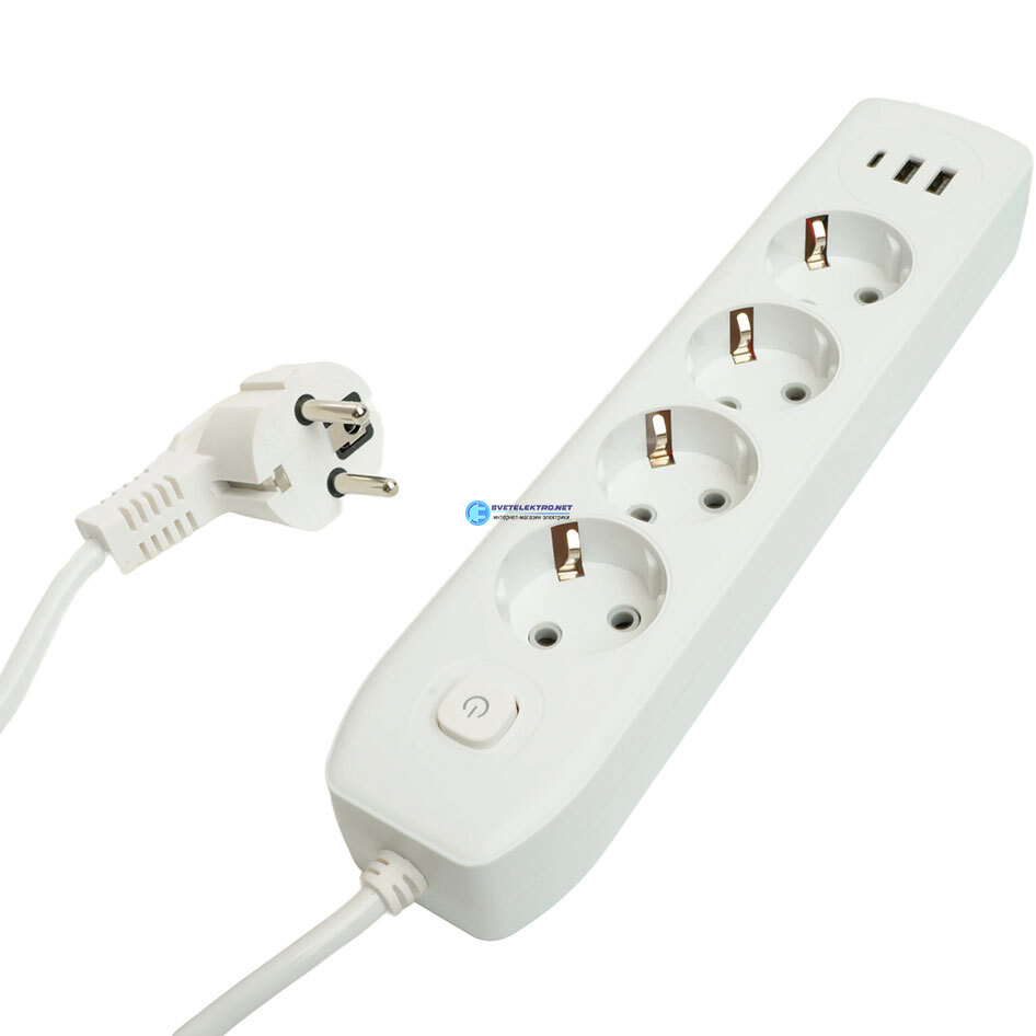 Удлинитель 4-местный c/з 3x1 мм2 3 м 250В 10А 2USB+1Type-C 2.4А серия Home белый HM08-43-02, код 49978, производитель Stekker