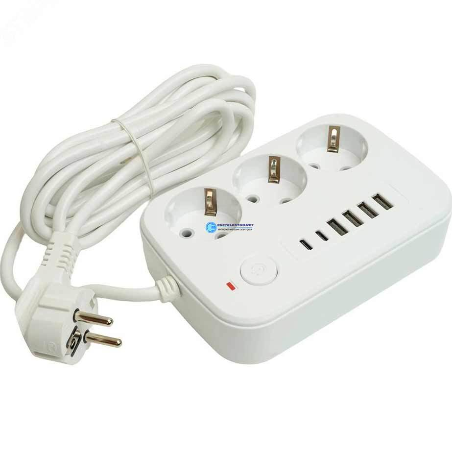 Удлинитель 3-местный c/з 3x1 мм2 3 м 250В 10А 4USB+2Type-C 2.4А серия Home белый HM09-36-02, код 49979, производитель Stekker