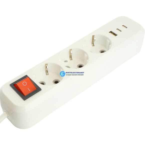 HM071-31-03 Удлинитель 3-местный с/з с выключ. 3x1мм2 3м 250В 16А 1USB+2C 2.4A сер Home белый HM071-31-03 50137 Stekker