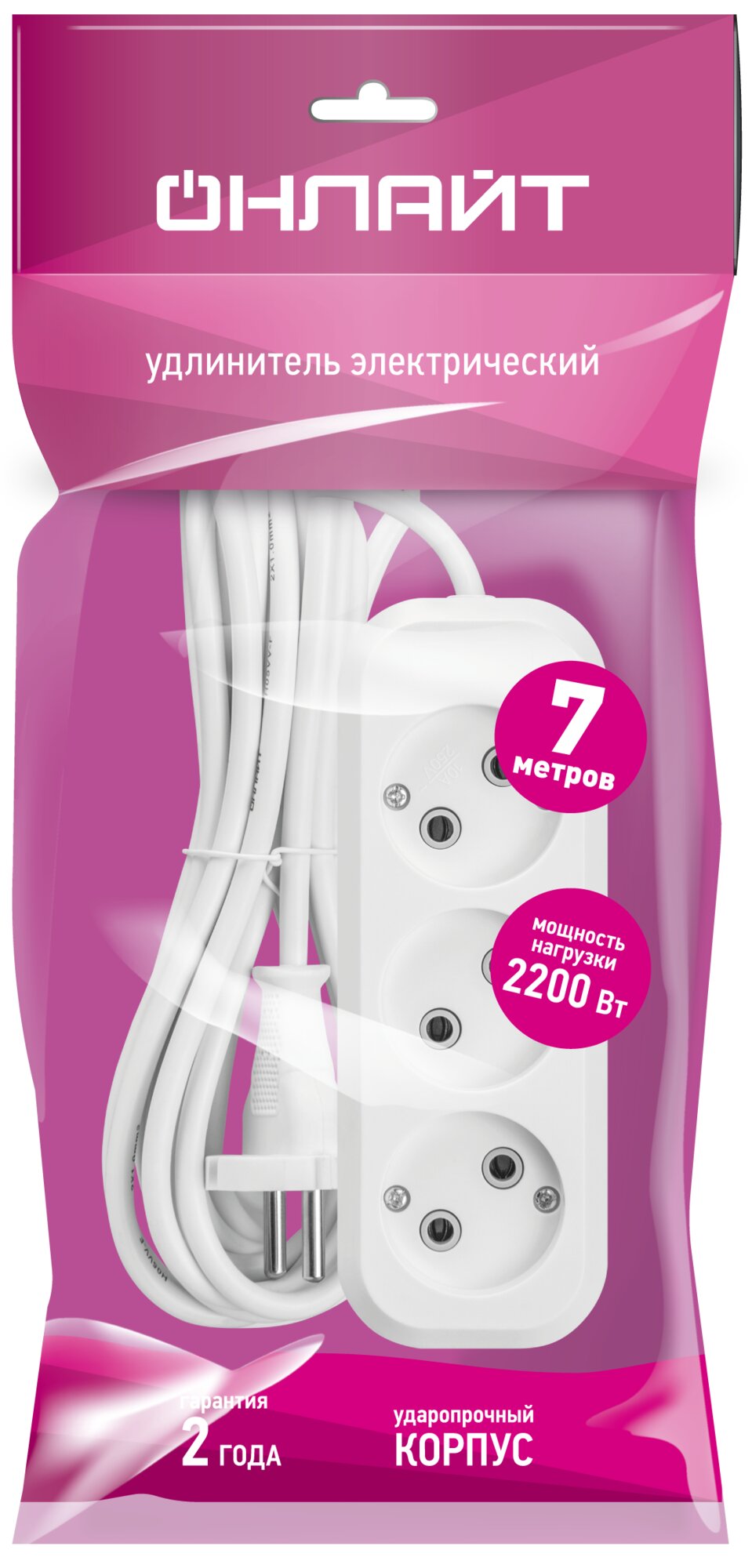 Удлинитель бытовой OPE-S-03-700-X-2x1 без заземления 3 розетки 7м ПВС 2х1 2200 Вт, код 90510, производитель ОНЛАЙТ