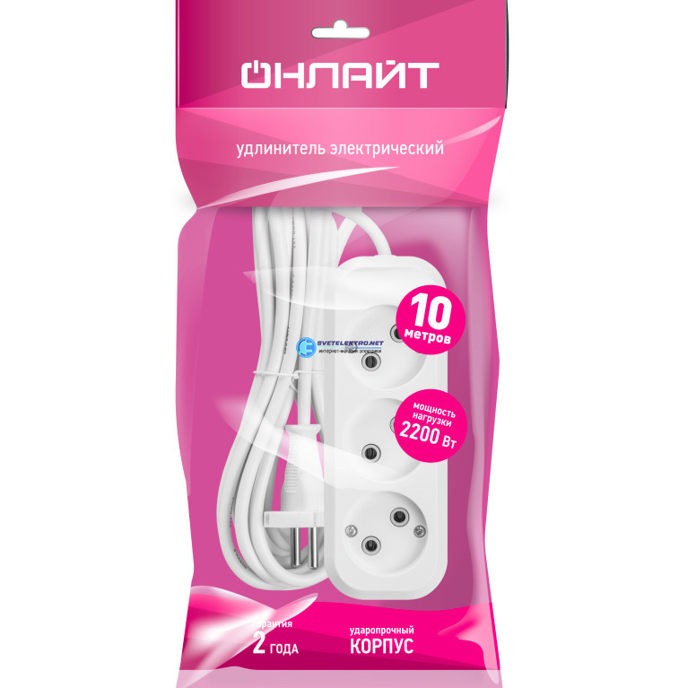 Удлинитель бытовой OPE-S-03-1000-X-2x1 без заземления 3 розетки 10м ПВС 2х1 2200 Вт, код 90511, производитель ОНЛАЙТ