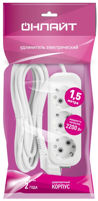 Удлинитель бытовой OPE-S-03-150-E-3x0.75 с заземлением 3 розетки 1,5м ПВС 3х0,75 2200Вт, код 90791, производитель ОНЛАЙТ