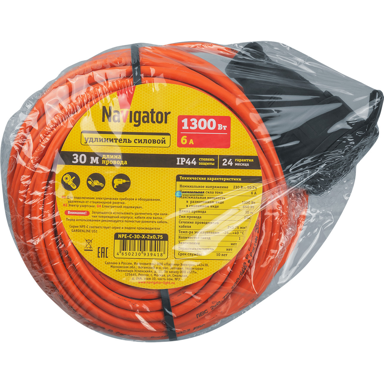 Удлинитель силовой NPE-C-30-X-2x0.75 шнур б/з 30м ПВС 2х0,75 1300 Вт IP44, код 93941, производитель Navigator