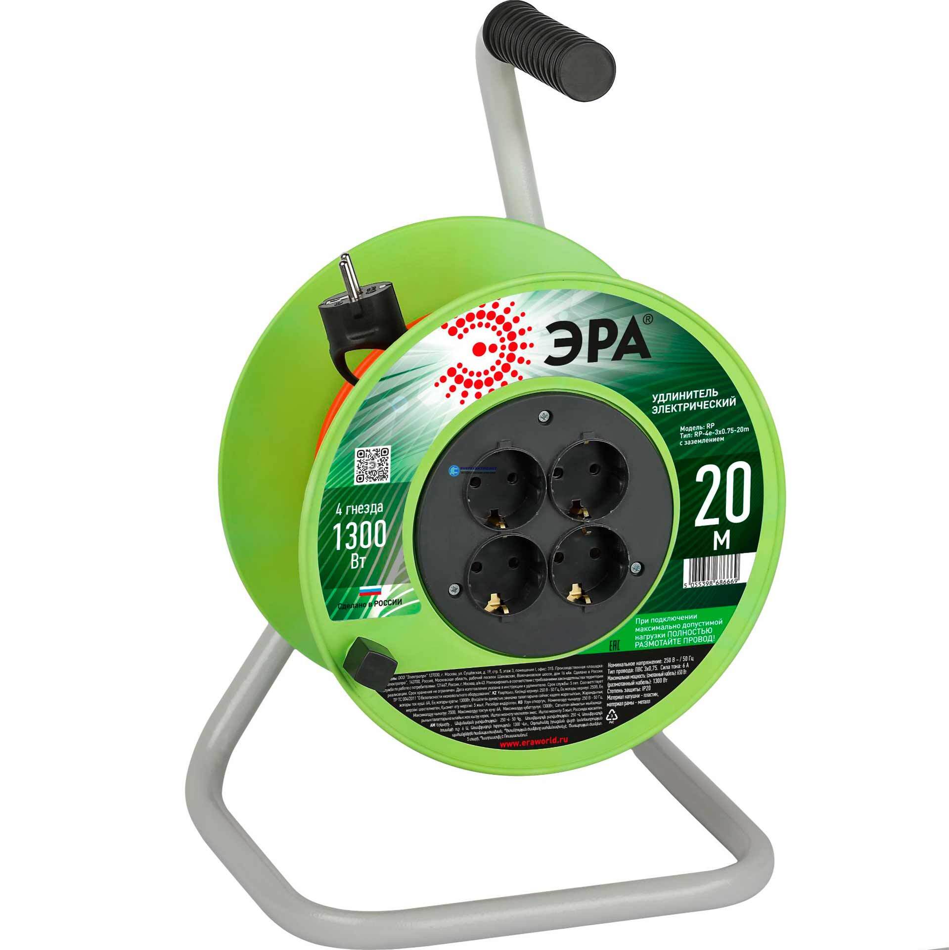 Удлинитель силовой RP-4e-3х0.75-20m на пластиковой катушке c заземлением 4 розетки 20м ПВС 3х0,75мм2, код Б0056096, производитель ЭРА