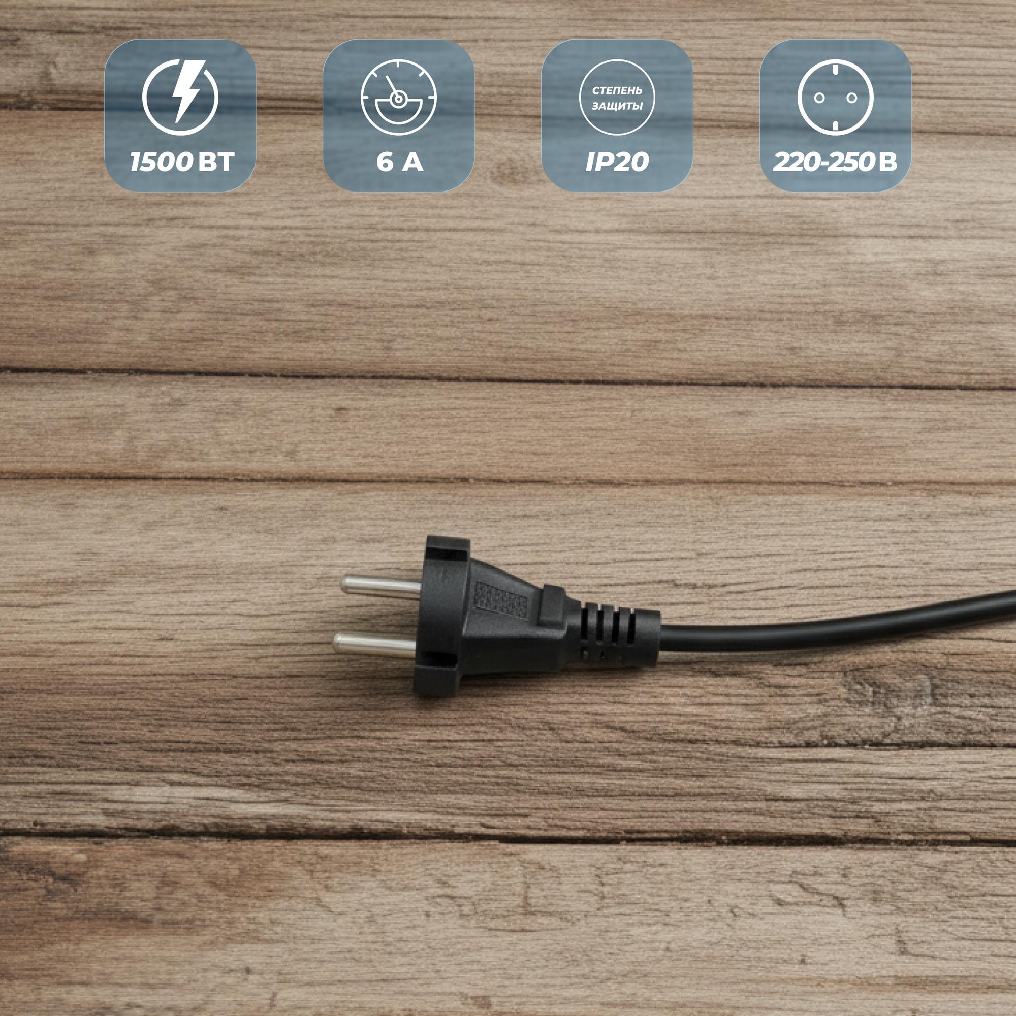 | Дополнительная информация: | номинальное напряжение – 220-250 В|максимальный ток нагрузки – 6 А|степень защиты – IP20|максимальная суммарная мощность нагрузки – 1500 Вт|сечение провода – ПВС 3 х 0.75|страна-производитель – Россия: |