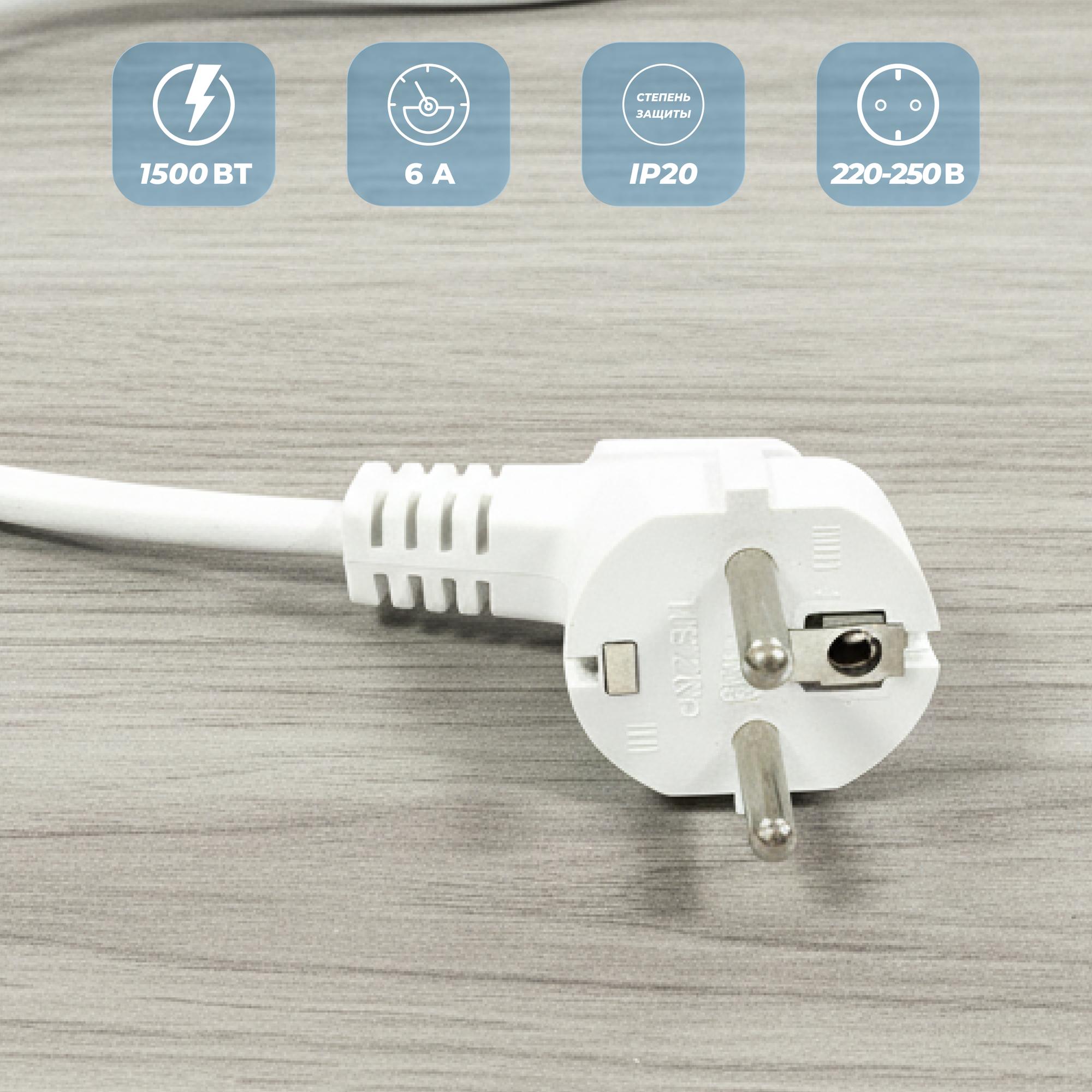 | Дополнительная информация: | номинальное напряжение – 220-250 В|максимальный ток нагрузки – 6 А|степень защиты – IP20|максимальная суммарная мощность нагрузки – 1500 Вт|сечение провода – ПВС 3 х 0.75|страна-производитель – Россия: |