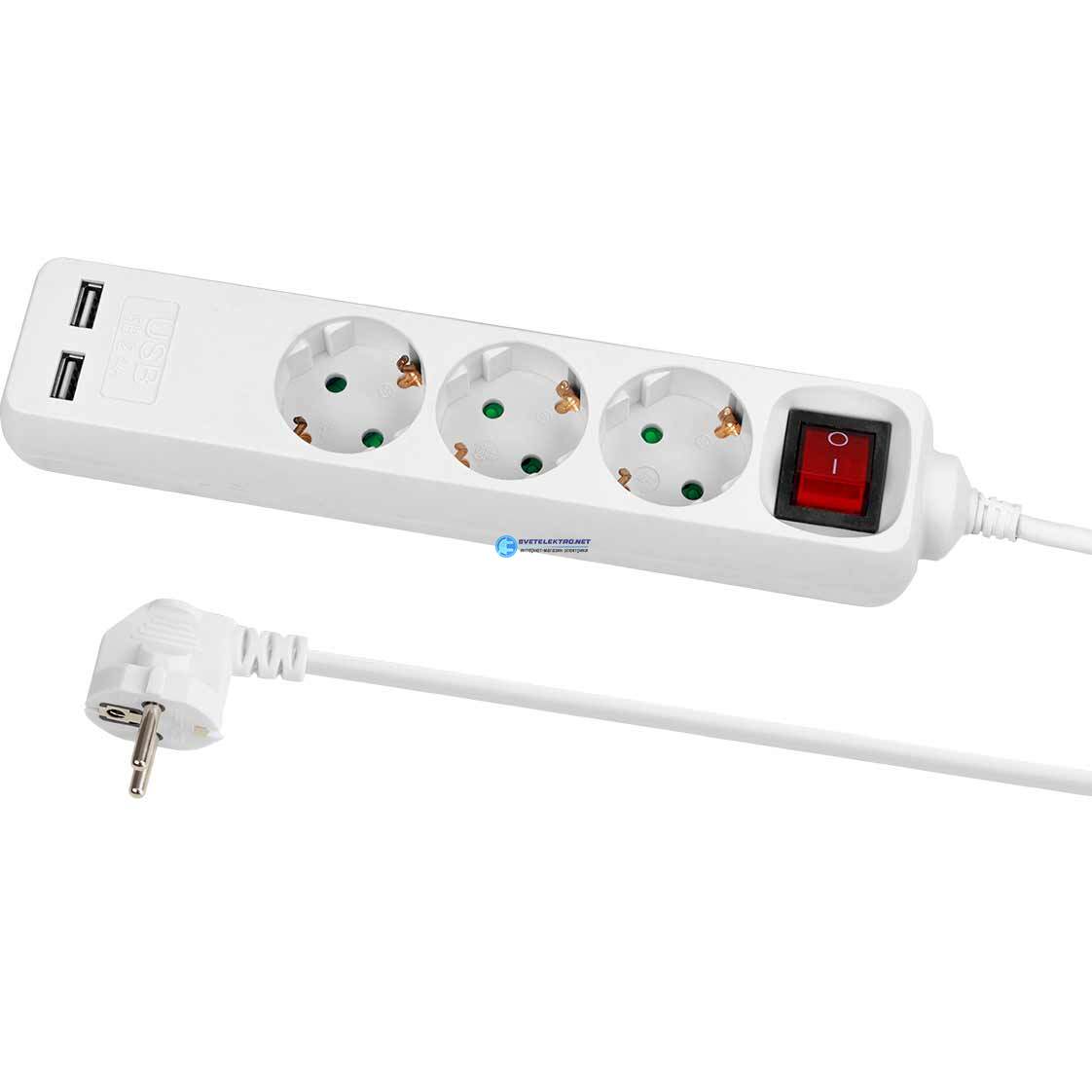 Удлинитель бытовой У03В-USB 3 гнезда, 2USB 2,4А, 1,5 м, вык., з/к, ПВС 3х0,75мм2 10А/250В белый SQ1303-0303 TDM