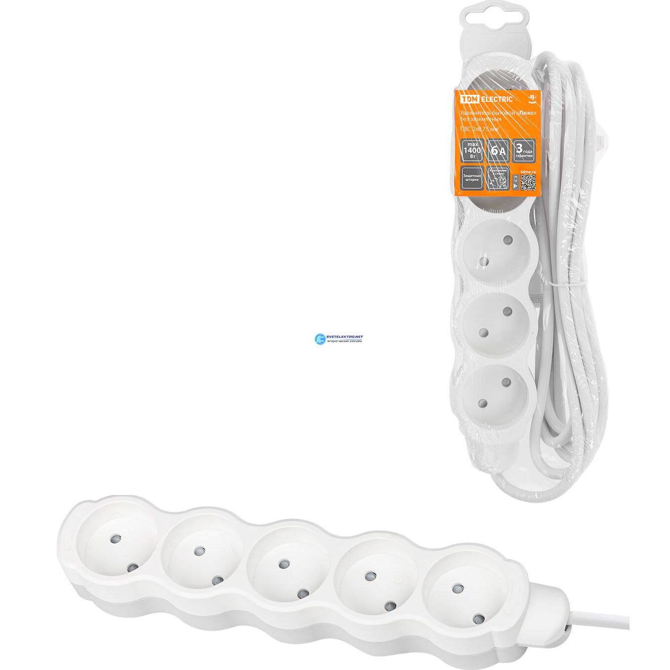 Удлинитель бытовой Люкс 5 гнезд 2 м б/з с з/ш ПВС 2х075 мм2 6 А 250 В 1400 Вт, код SQ1303-4011, производитель TDM