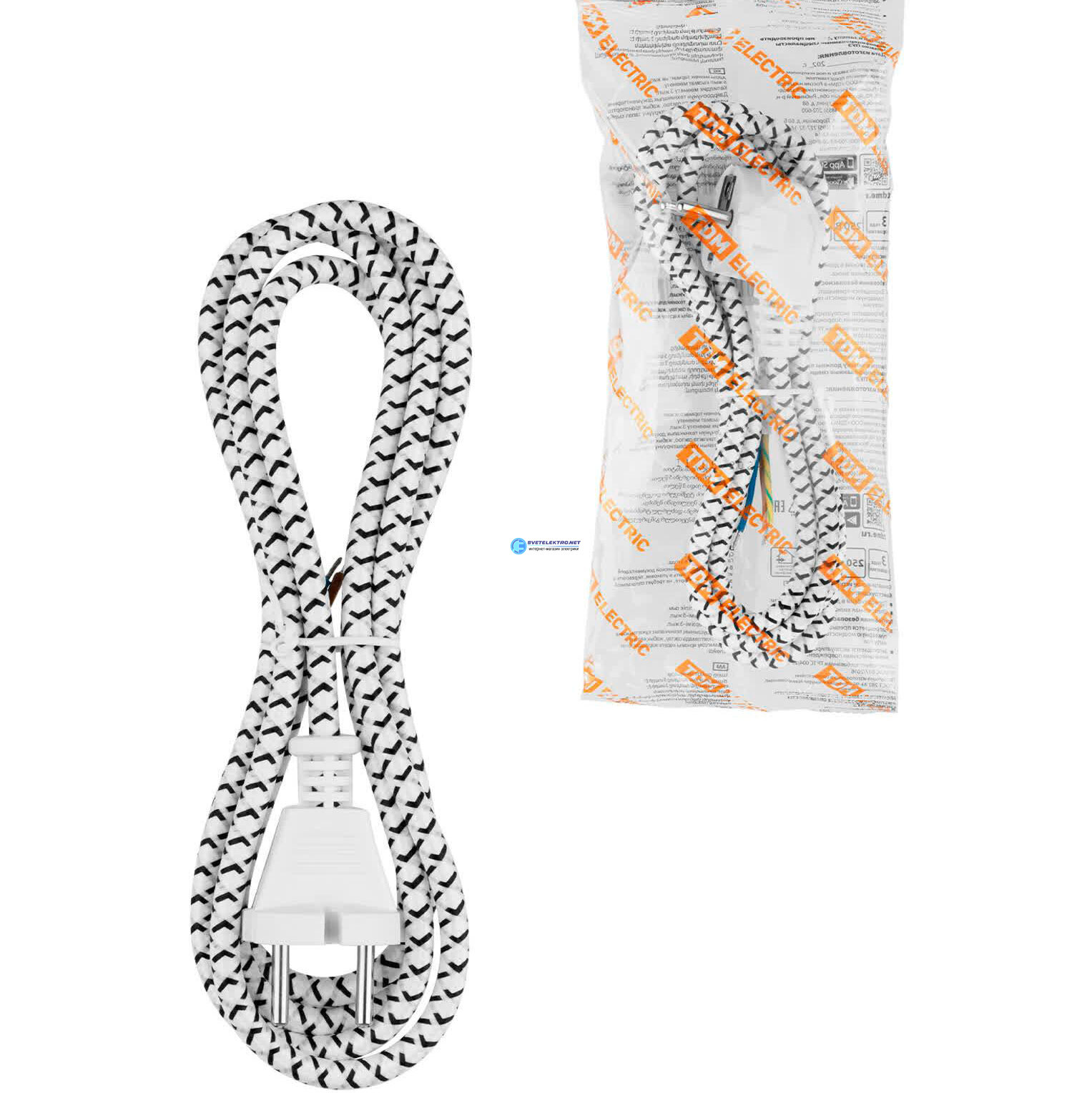 Шнур сетевой с вилкой в тканевой оплетке ПВС 2x075мм2 18м 1400 Вт б/з белый, код SQ1305-0091, производитель TDM