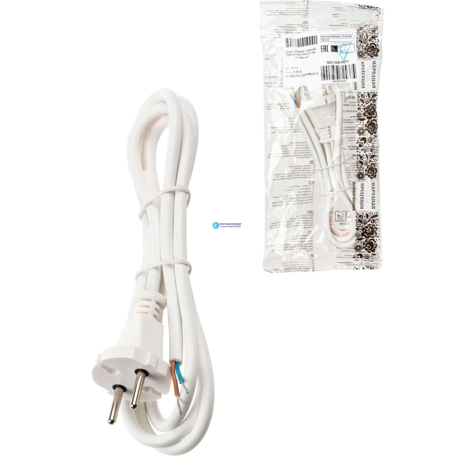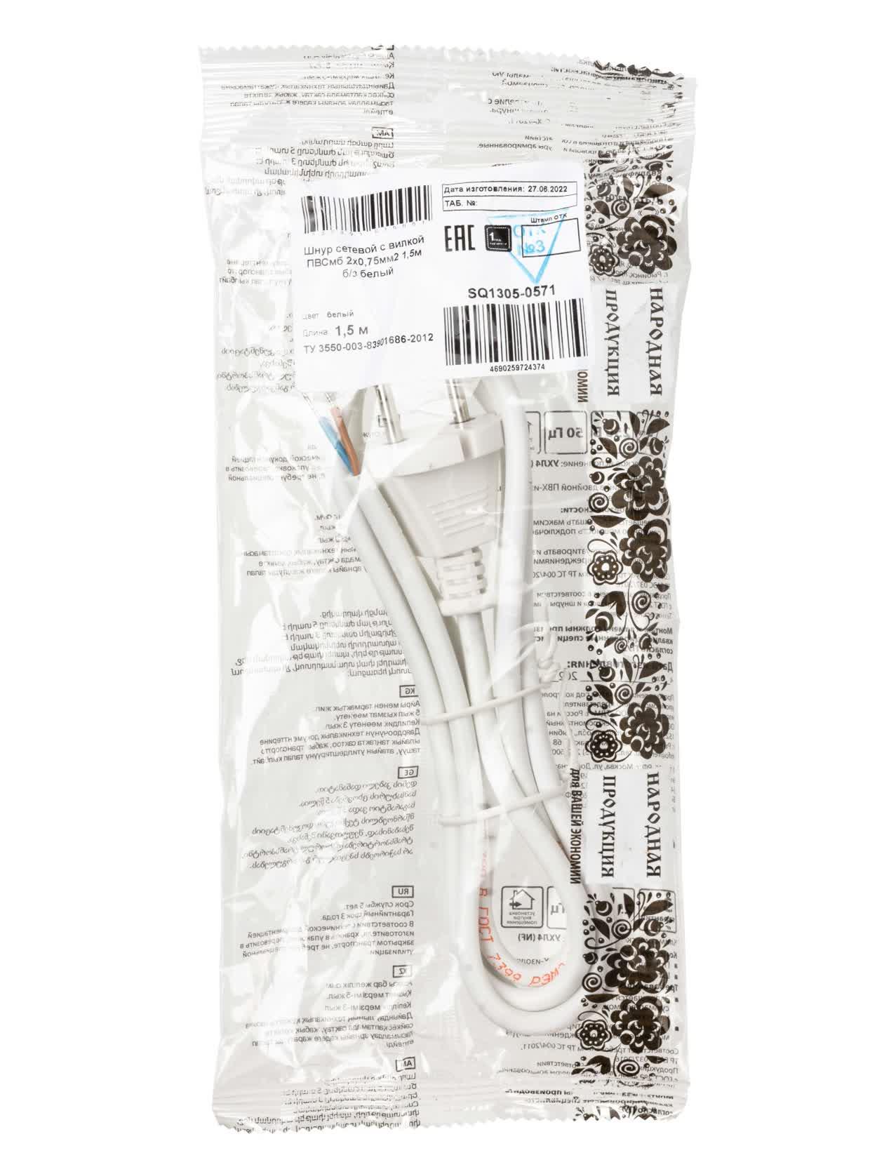 Шнур сетевой с вилкой ПВСмб 2x0.75мм2 15м б/з белый Народный, код SQ1305-0571, производитель TDM
