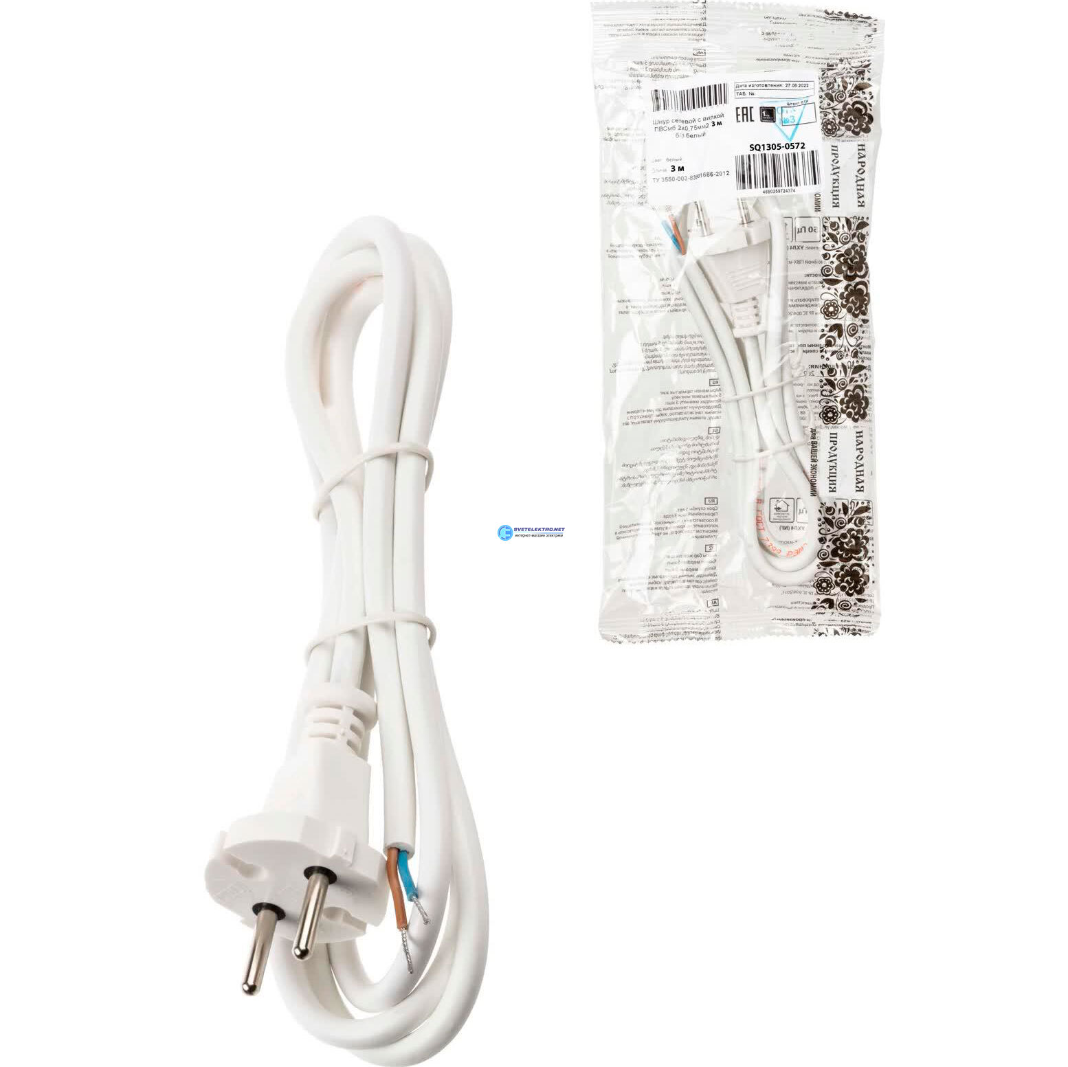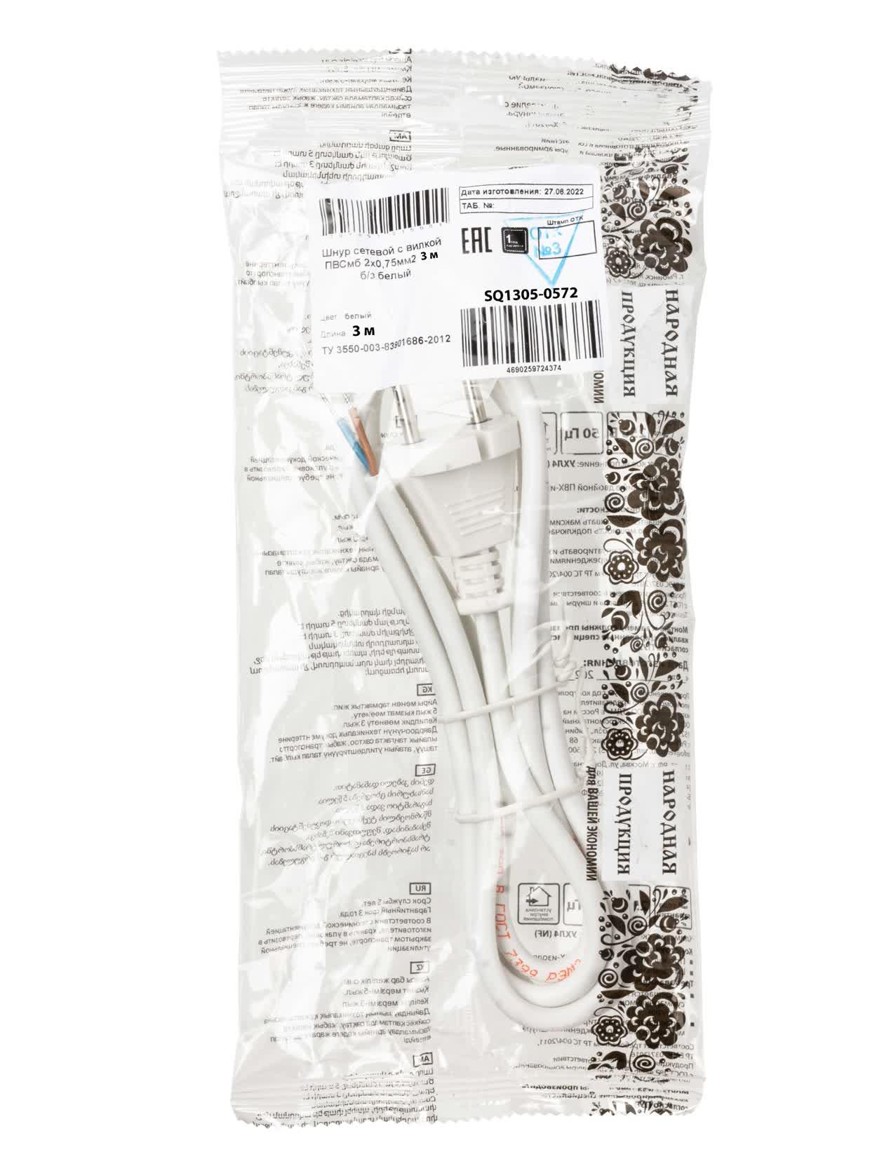 Шнур сетевой с вилкой ПВСмб 2x0.75мм2 3м б/з белый Народный, код SQ1305-0572, производитель TDM