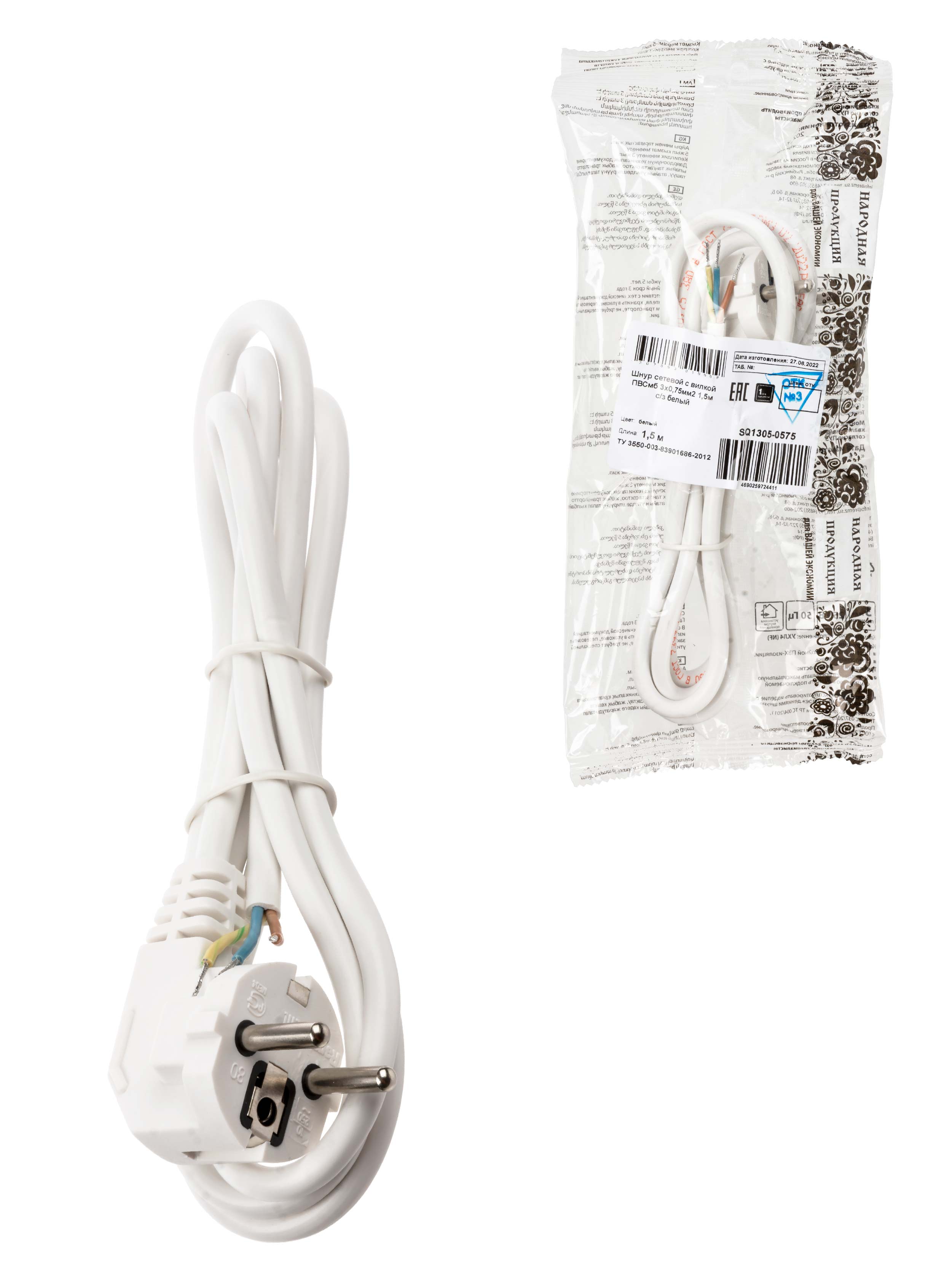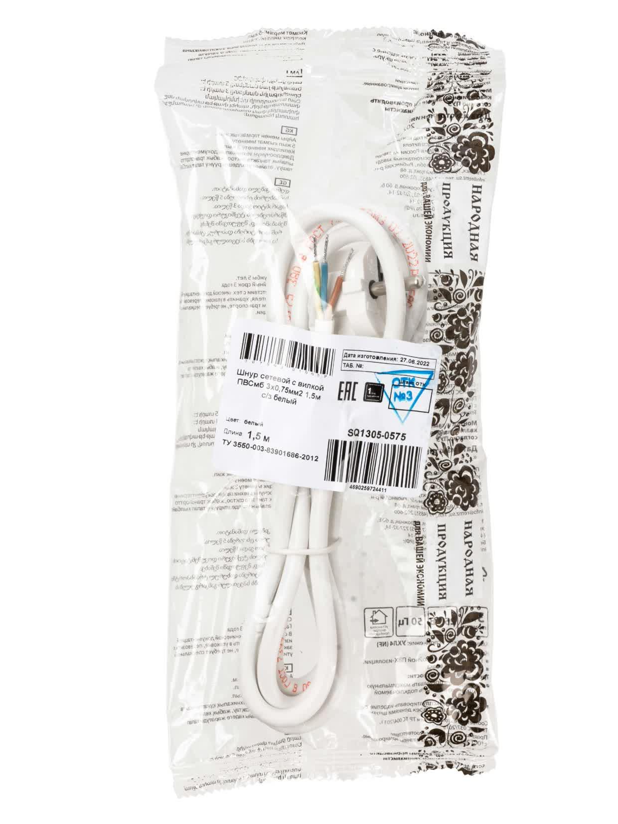 Шнур сетевой с вилкой ПВСмб 3x0.75мм2 15м с/з белый Народный, код SQ1305-0575, производитель TDM