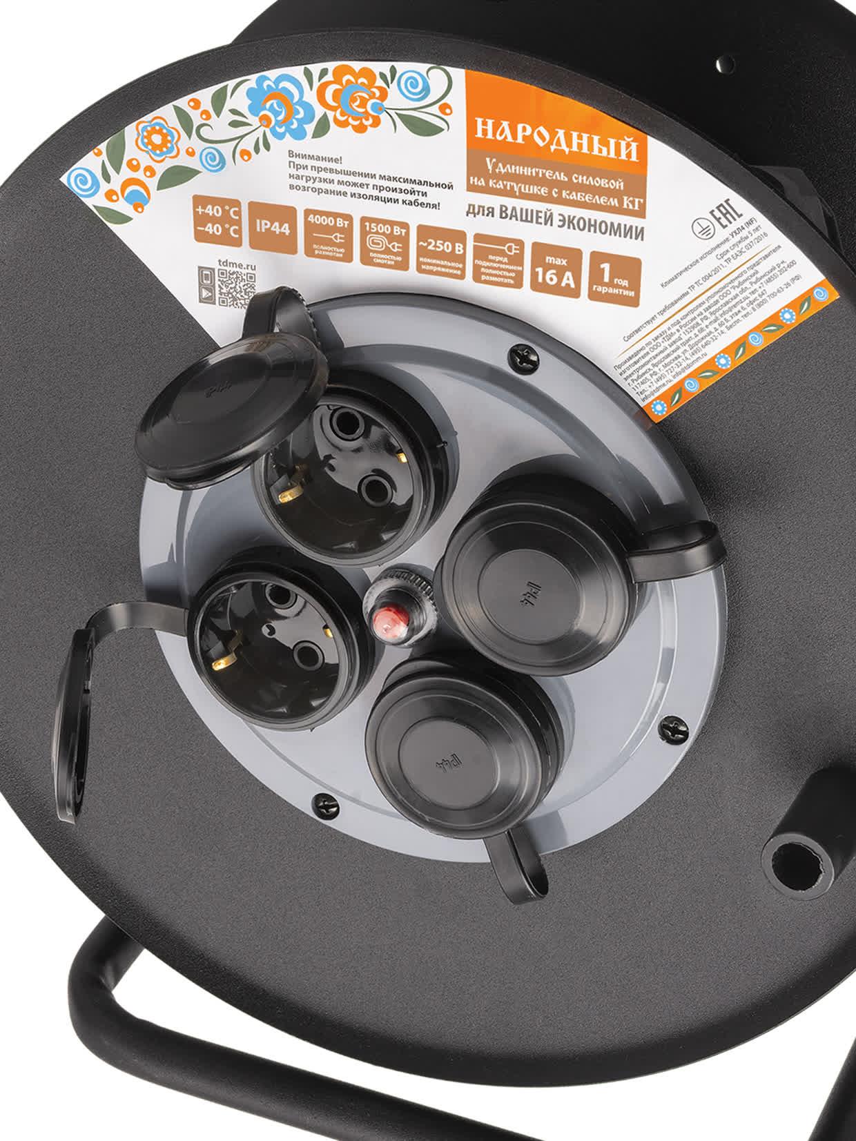Удлинитель силовой УХз16-004 метал. катушка А3 4 места IP44/50 м КГ 4000 Вт Народный, код SQ1307-0172, производитель TDM