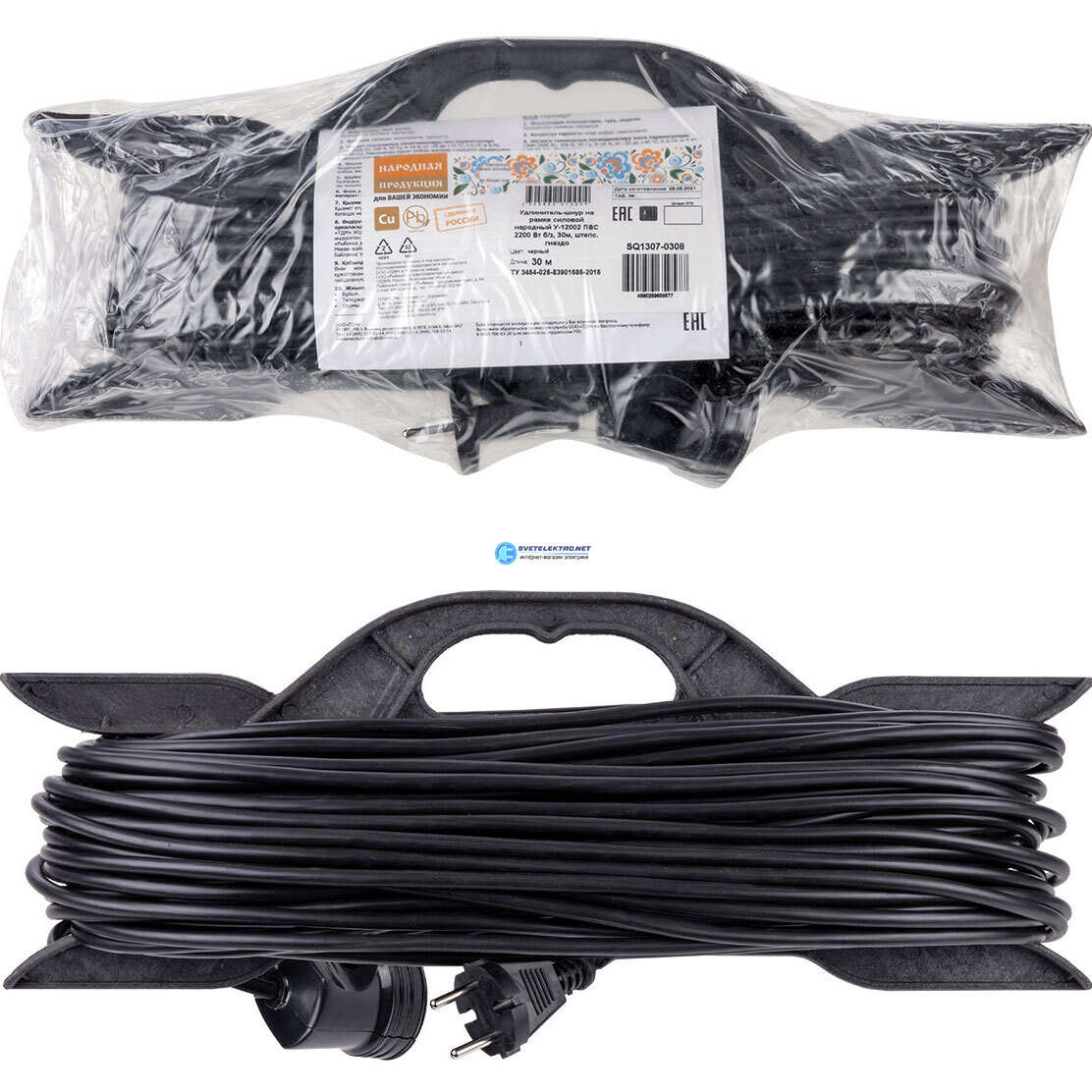 Удлинитель-шнур на рамке силовой народный ПВС 2200 Вт б/з 30м штепс. гнездо, код SQ1307-0308, производитель TDM