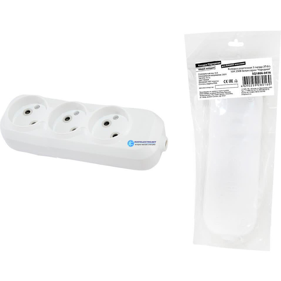 Колодка розеточная 3 гнезда 2П б/з 10А 250В белая серии Народная, код SQ1806-0416, производитель TDM