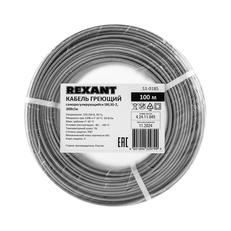 Кабель нагревательный саморегулирующийся SRL30-2, неэкранированный, 30Вт/м, 0,9мм2/55м, код 51-0185, производитель REXANT